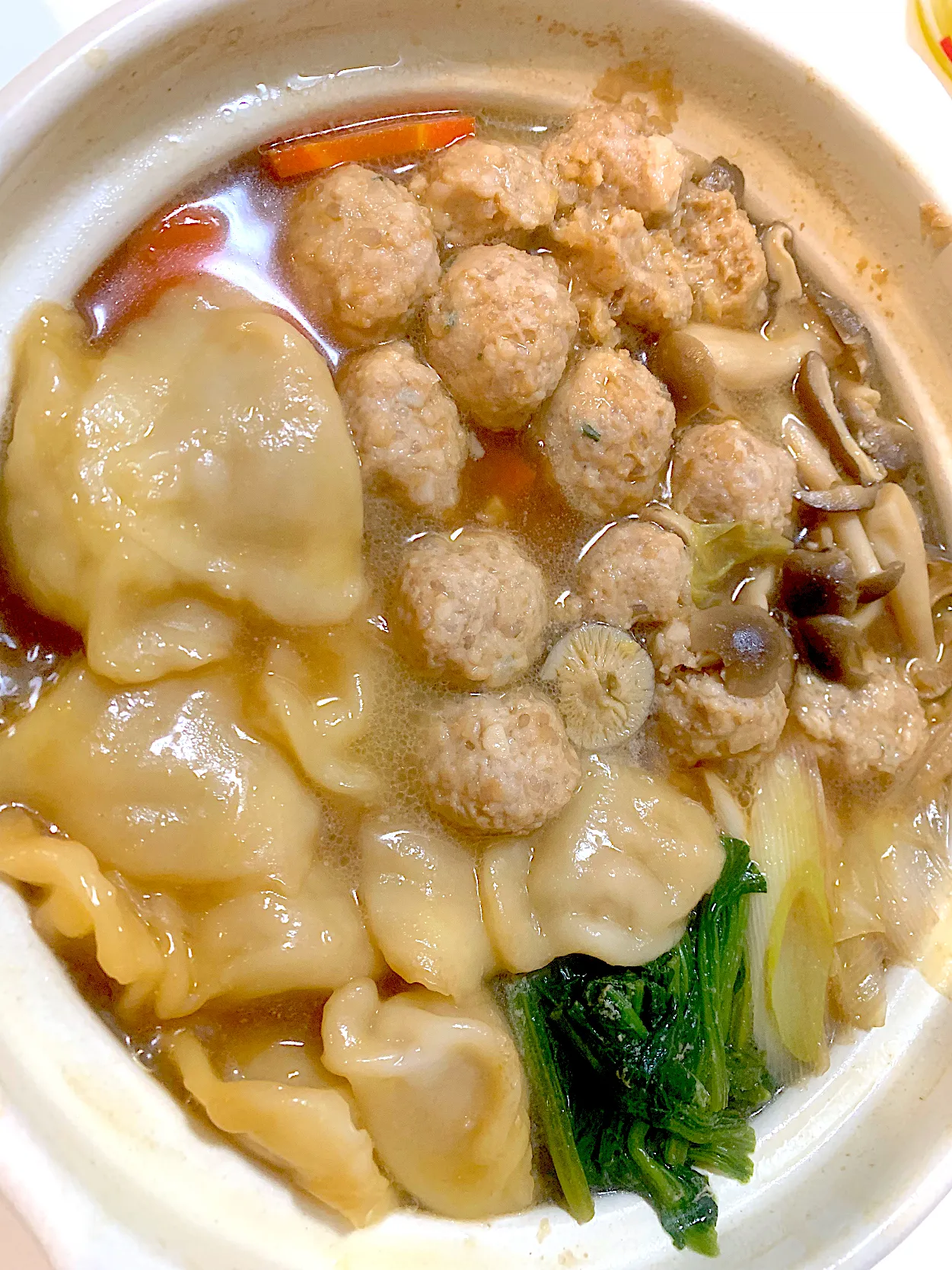 今夜は鶏団子鍋🍲後から水餃子投入🥟