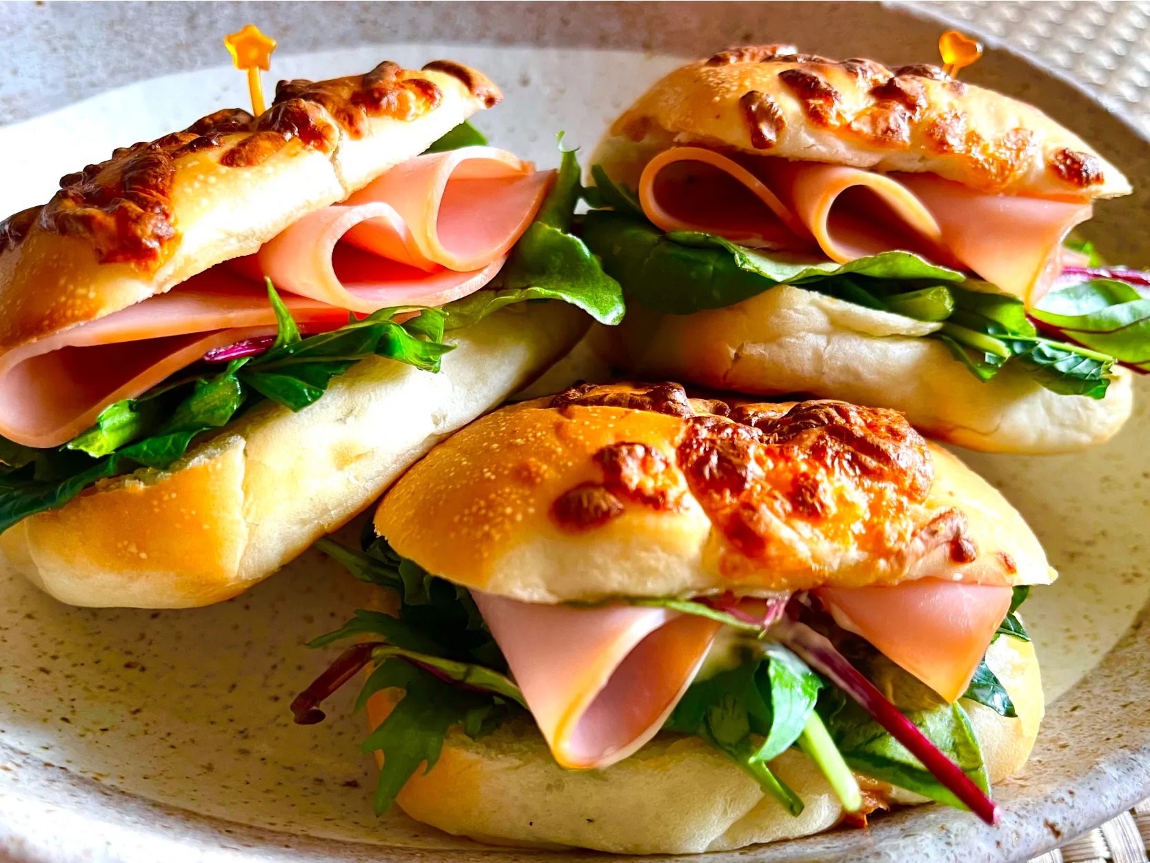 ロールパンより小さなチーズパンに ベビーリーフ🌿とハムを無理矢理挟んだサンドウィッチ