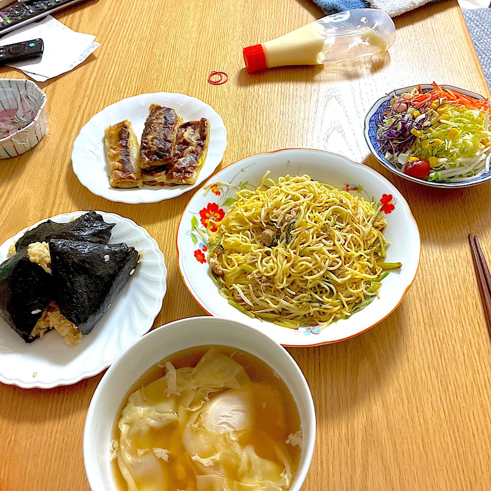 塩焼きそば、たぬきにぎり、春巻き、グリーンサラダ、玉子入りワンタンスープ。
