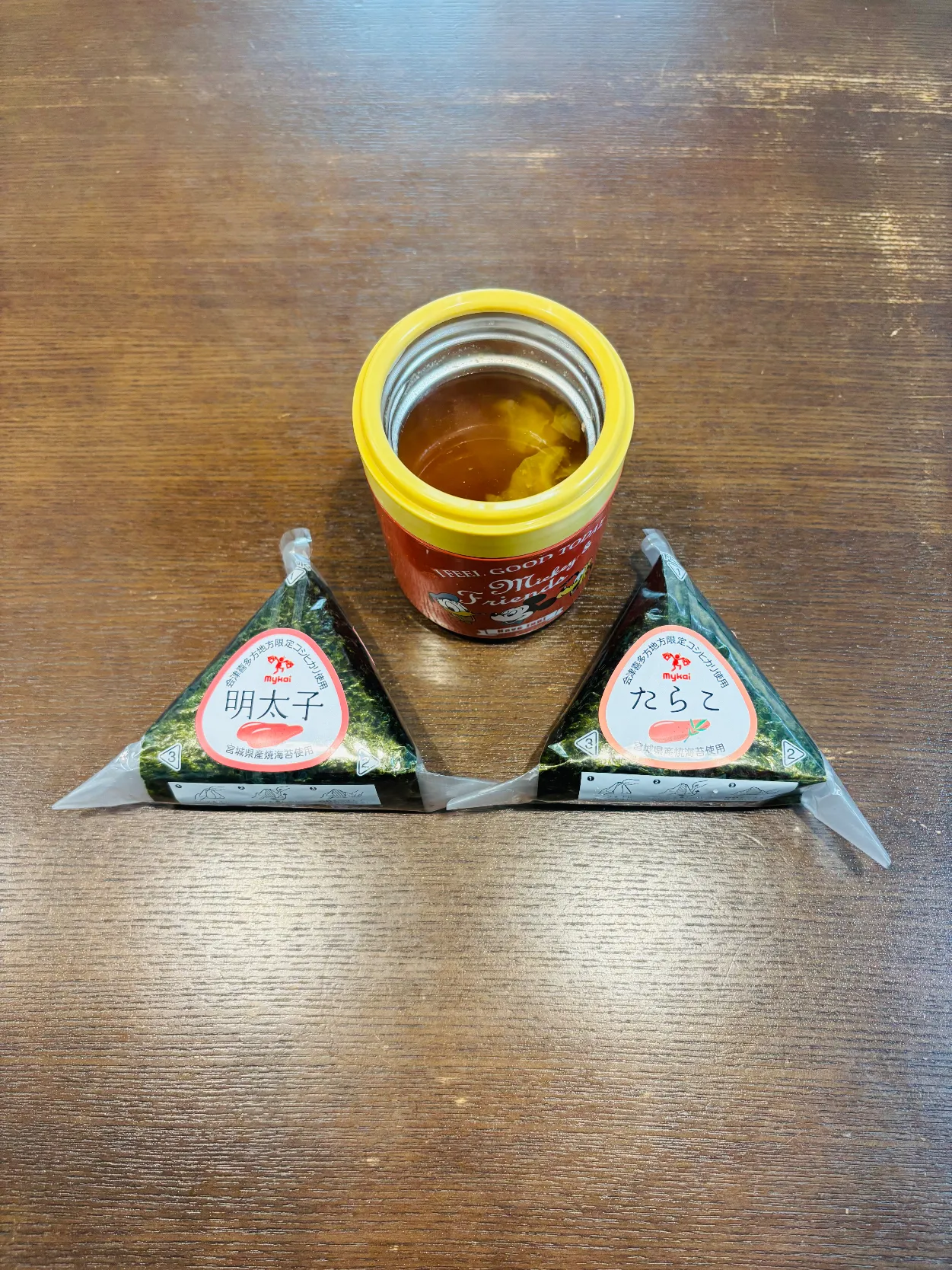明太子おにぎり、たらこおにぎり🍙、マグロのアラのみそ汁。