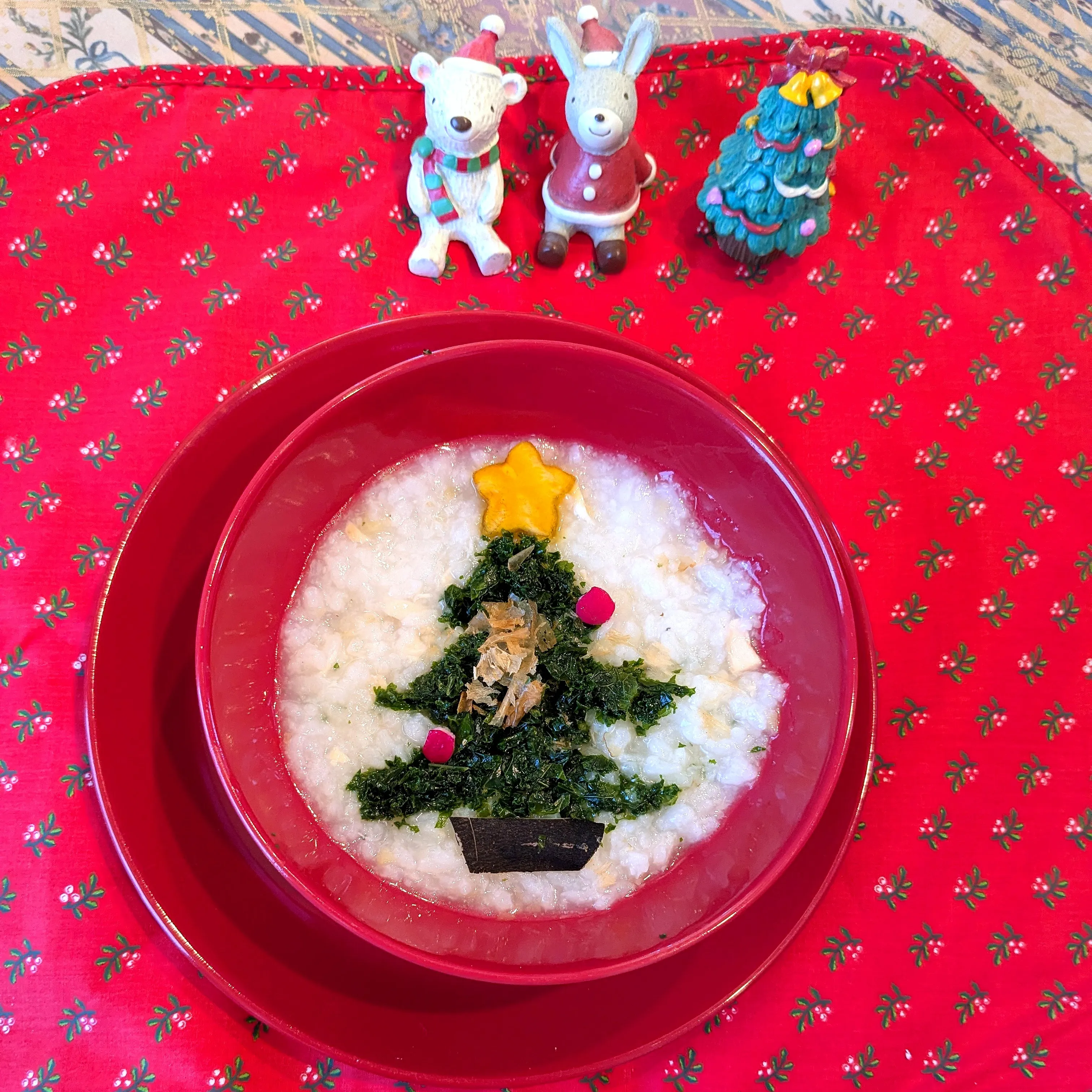 みじん切り生姜とウェイパーで味付けし、具に少し鶏むね肉を入れて煮込み、ごま油で炒めたケール💚とイエロービーツ💛を星形に、黒大根🤎で幹を作り、赤いのはラディッシュ❤️です