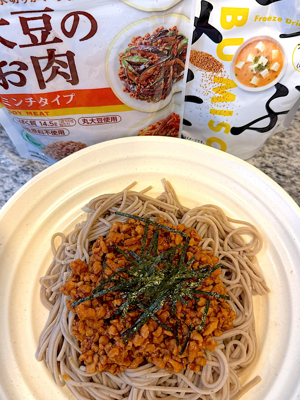 夏バテに!大豆のお肉&つぶみそと乾十割でラー油肉味噌蕎麦つくってみた