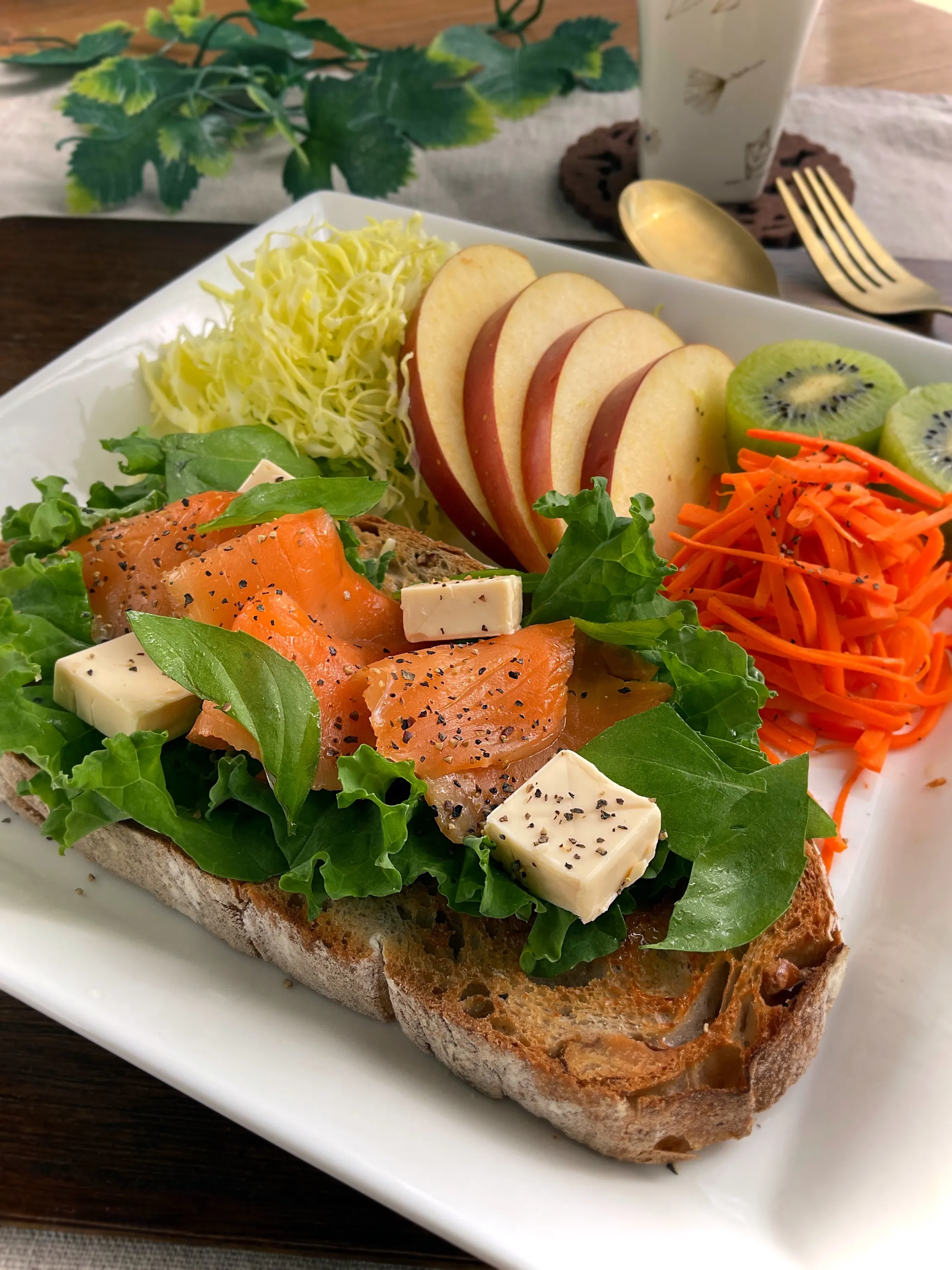 カンパーニュも買ったものだし、スモークサーモンやクリームチーズものせてるだけ…