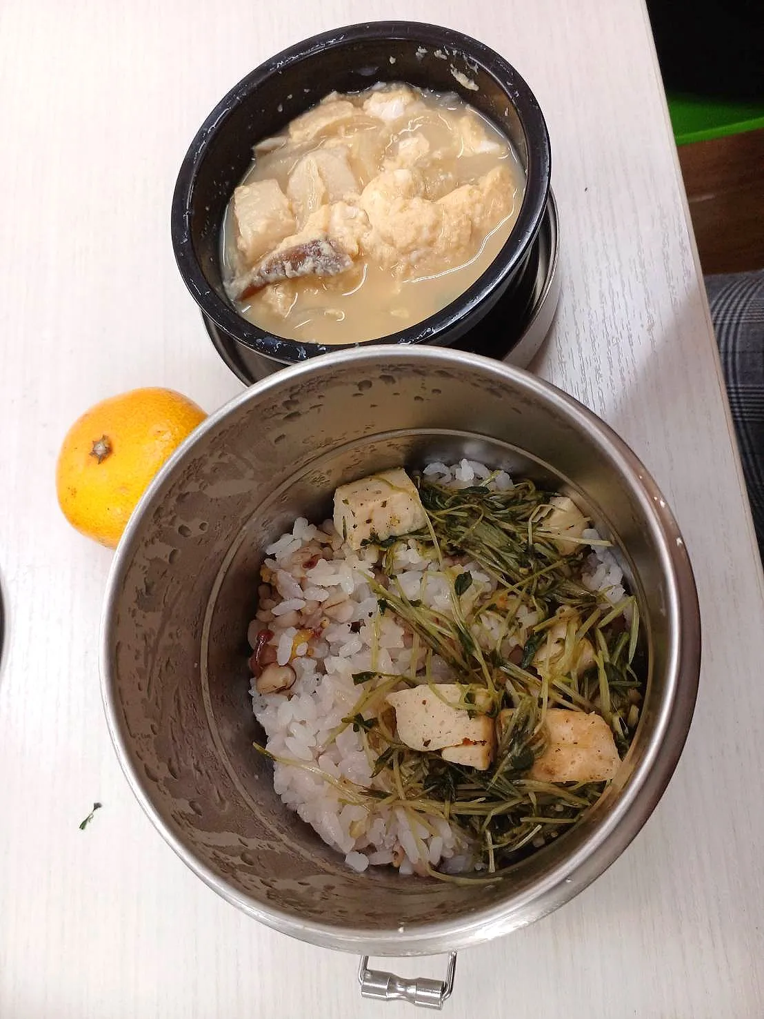 保温ランチジャー弁当(帆立と椎茸の親子丼風)、豆苗とサラダチキンの炒め物
