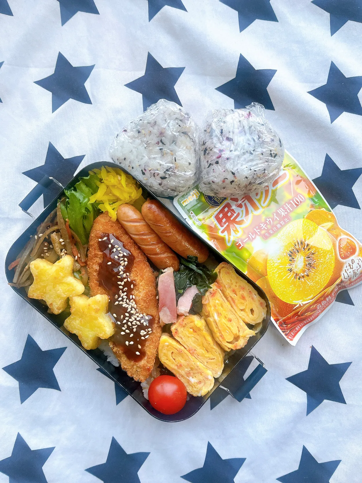 白身魚のフライ、星ポテト、きんぴらごぼう、干し海老入卵焼き、ベーコンほうれん草のバターソテー、千切り沢庵、ウインナー、ミニトマト