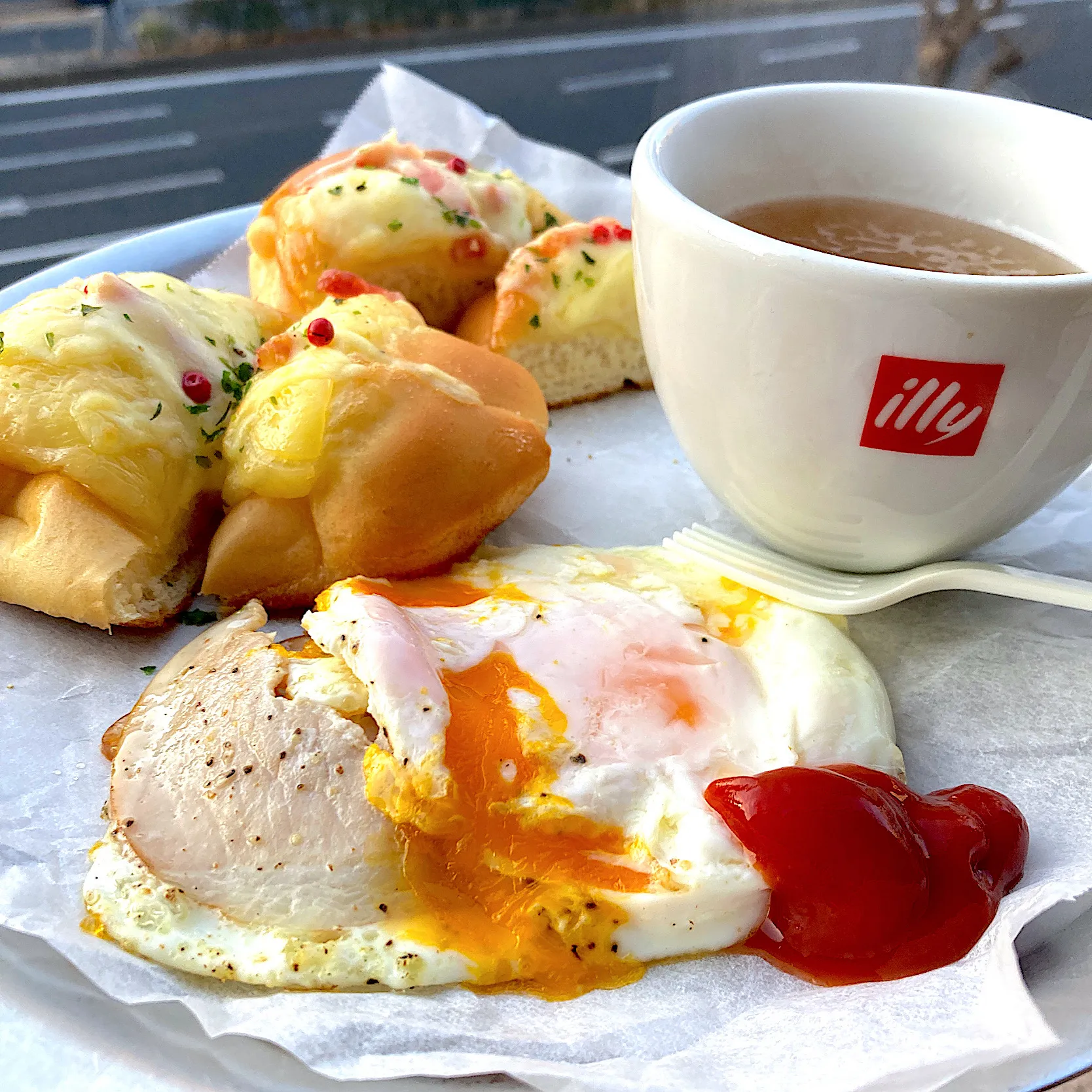 暖かくなりそうな朝に買って来たパンとハムエッグで朝ごはん。