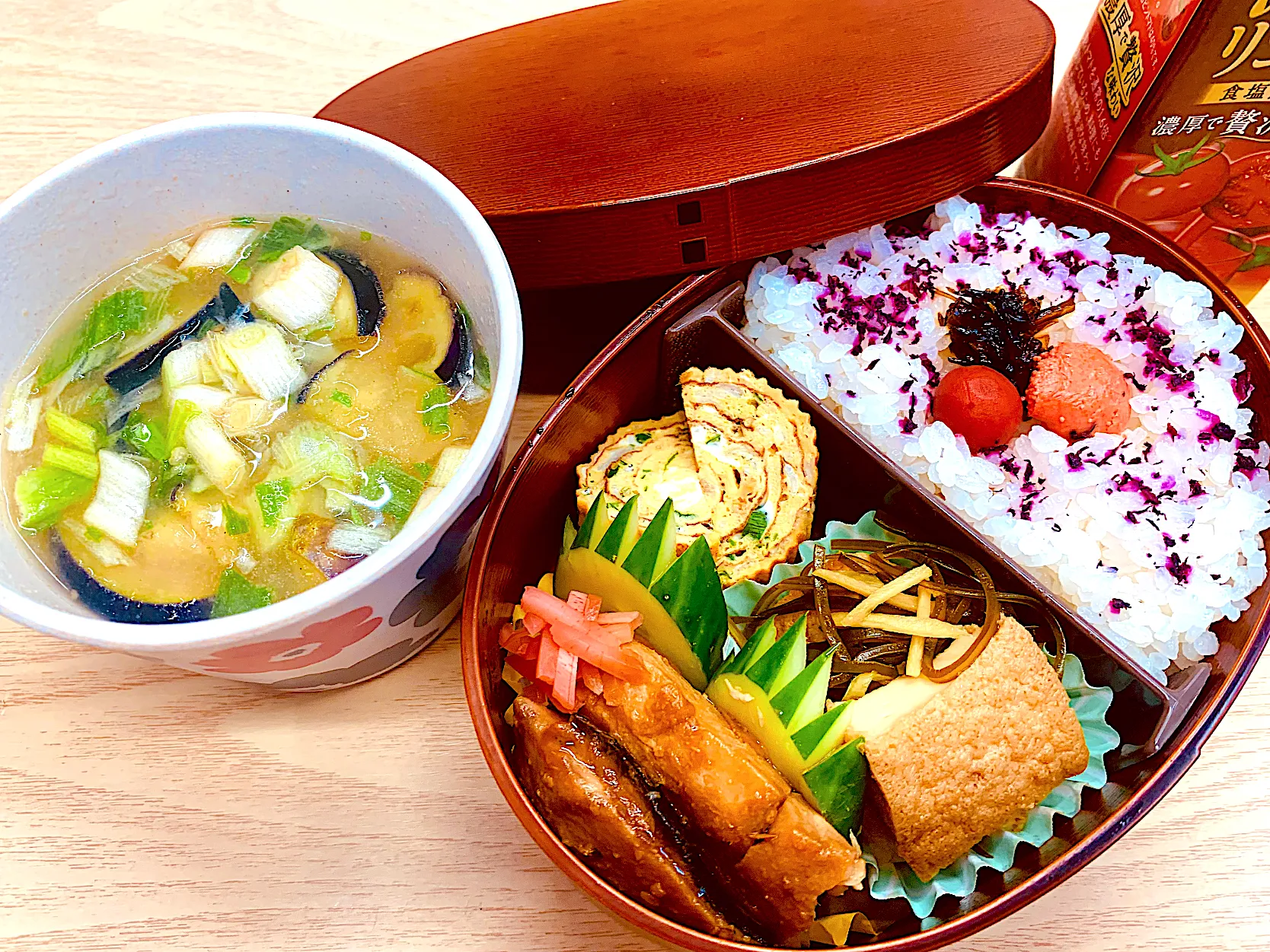父の和弁当。ブリ照り、シラスと九条ネギの出汁巻き、厚揚げと切り昆布の煮物。