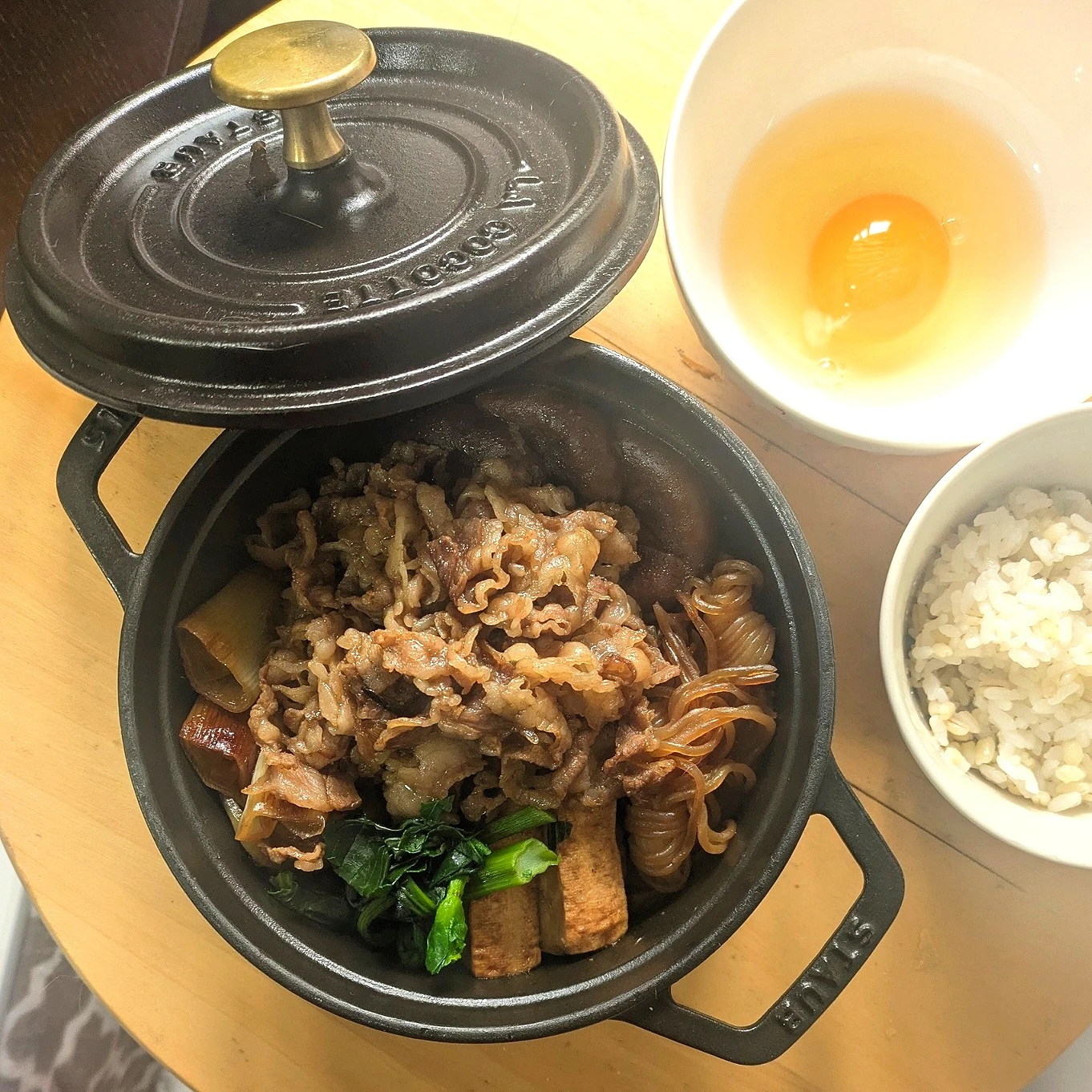 #国産 #黒毛和牛 #切り落とし #玉葱 #白葱 #しらたき #焼き豆腐 #春菊かわり #菜の花 #白菜入れ忘れた #牛蒡も忘れてたー #キビ砂糖#酒 #ヤマニ #吟醸 #九州甘口醤油 #STAUB #もち麦ごはん