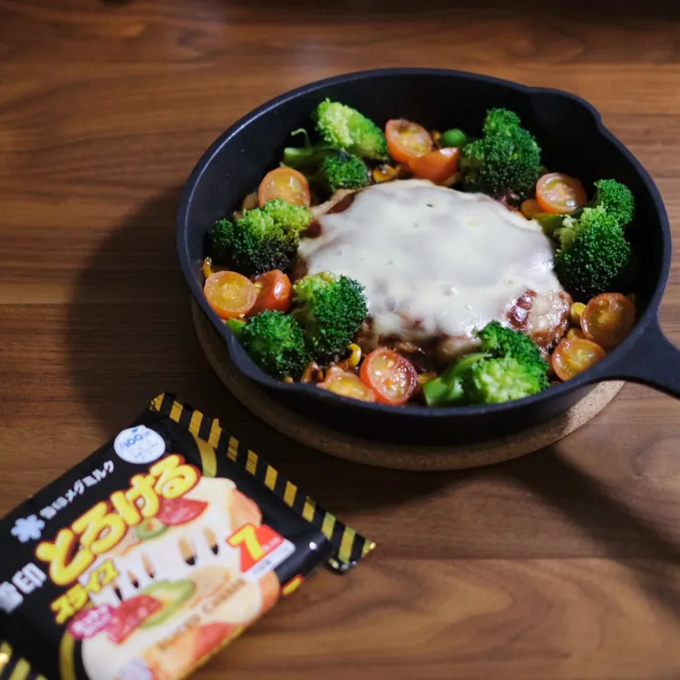 #チーズハンバーグ #チーズ #ハンバーグ #ブロッコリー #ミニトマト #とうもろこし #雪印メグミルクとろけるスライス