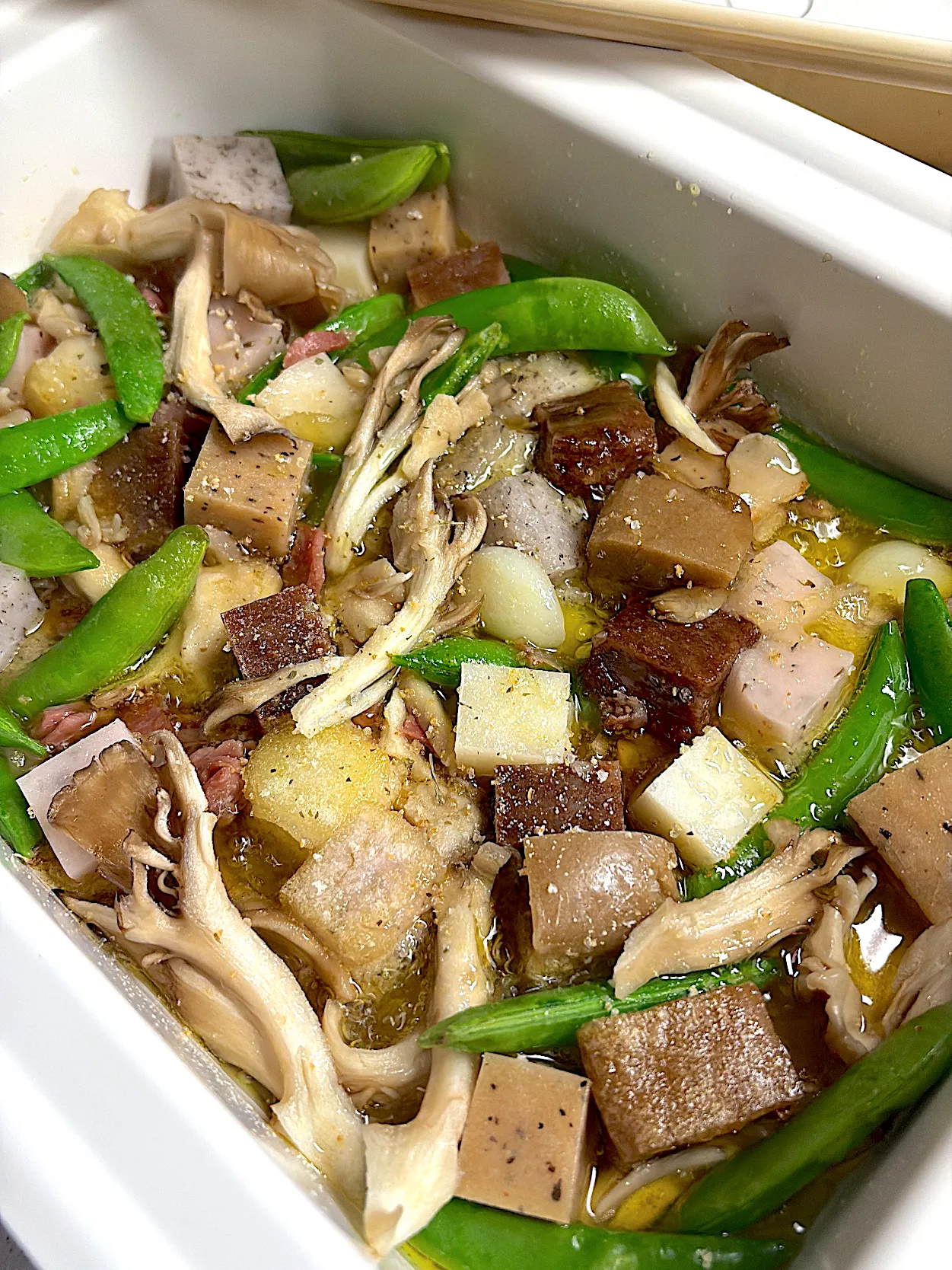 ちょっと乾燥しちゃった生ハムと舞茸とスナップエンドウとニンニクを入れて、すこーしガーリックパウダーかけました!
