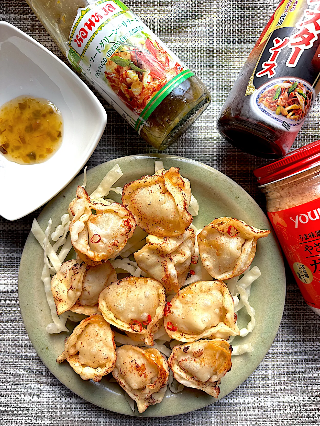 しっかり味付けしてそのままでも美味しい!揚げ餃子とシーフードグリーンチリソースの相性は抜群。