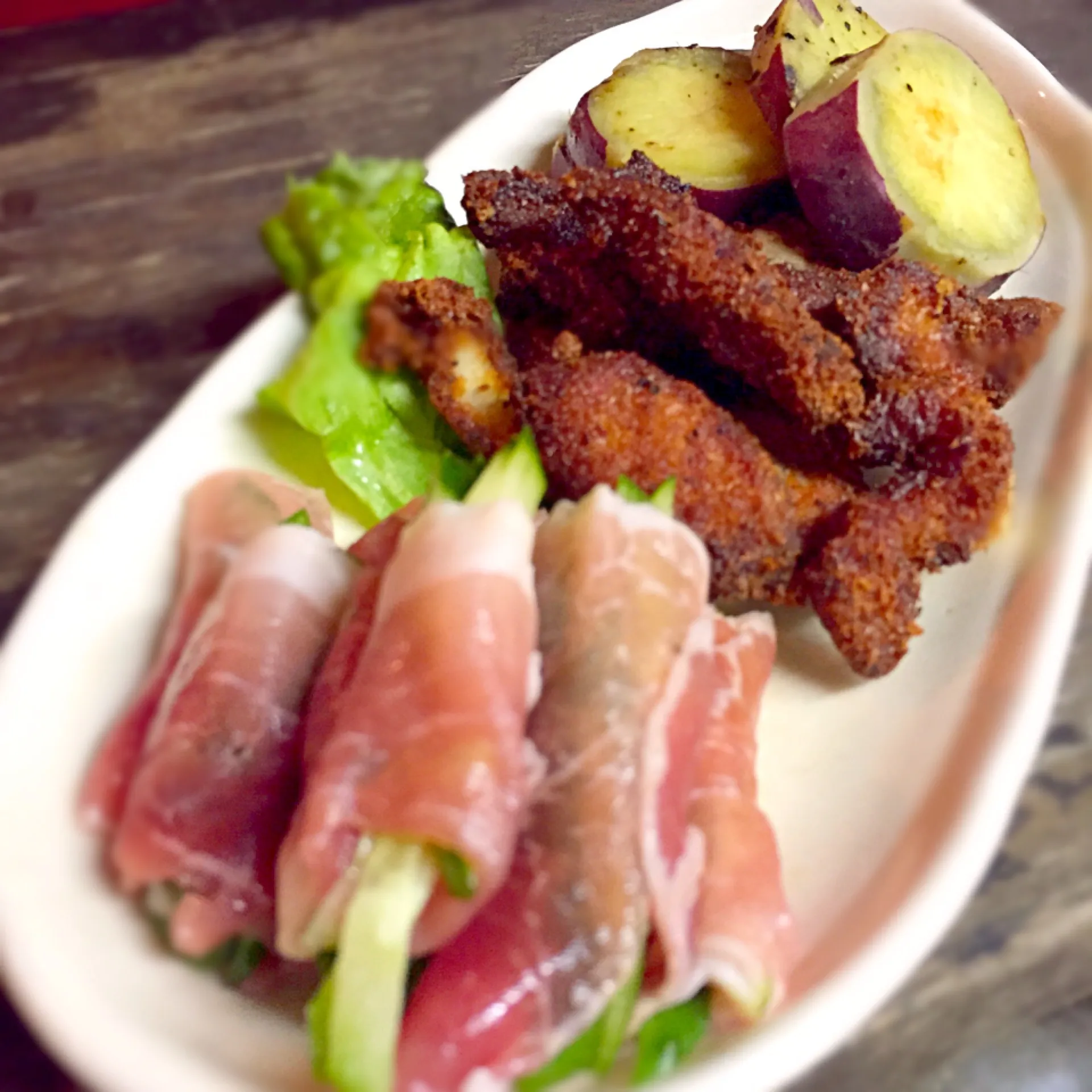 店があるのでゆっくりお祝いするのは日曜日ってことにしたんだけど、当日何もないのも淋しいので、前菜的なものは次女の好きな生ハムと数日前に食べたいって言ってたさつまいもを。。。