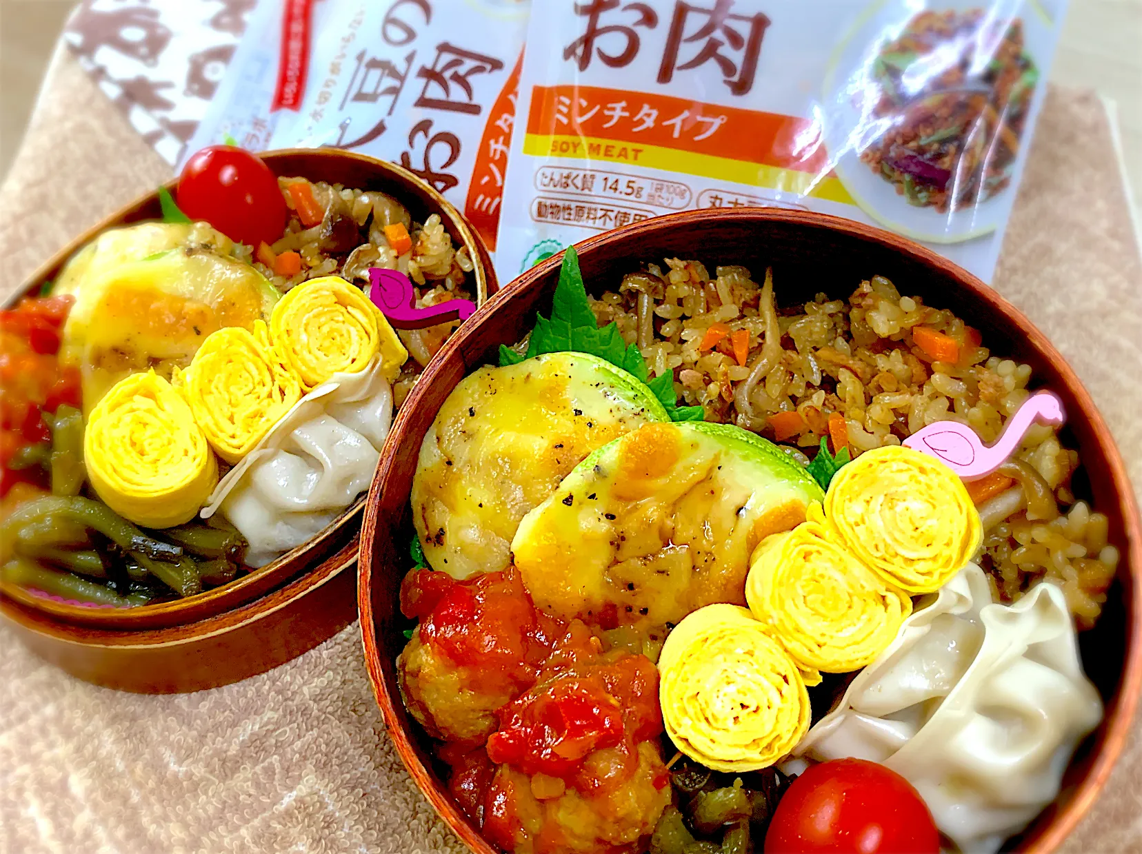 #家庭菜園野菜 #お弁当 #大豆ミート #炊き込みご飯 #サルサソース #少ない材料で