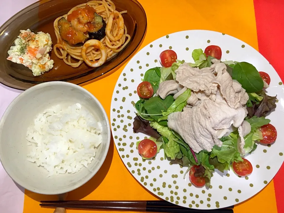 冷しゃぶサラダとトマトソースのパスタとポテトサラダです。ご馳走様でした😊