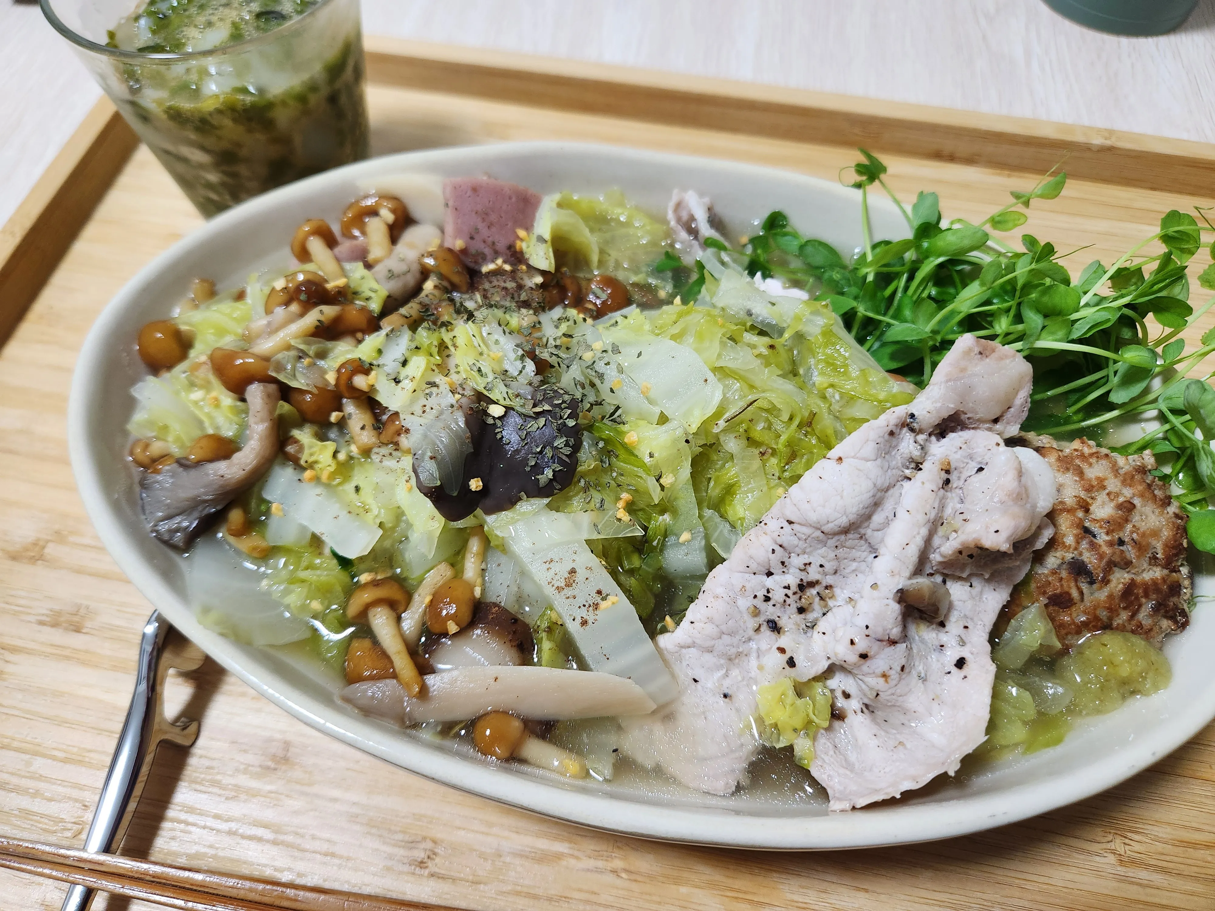 冷蔵庫にある白菜、レタス、なめこでスープ。と、めかぶとイカ刺しを追加で。#ダイエット中 #ケトジェニック #みんなの応援ごはんフェスティバル
