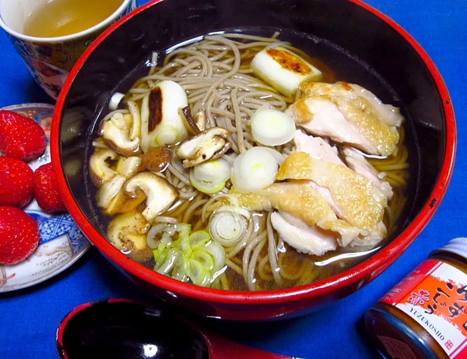 20150411昼食。鶏南蛮蕎麦に炒めた椎茸も添えて。