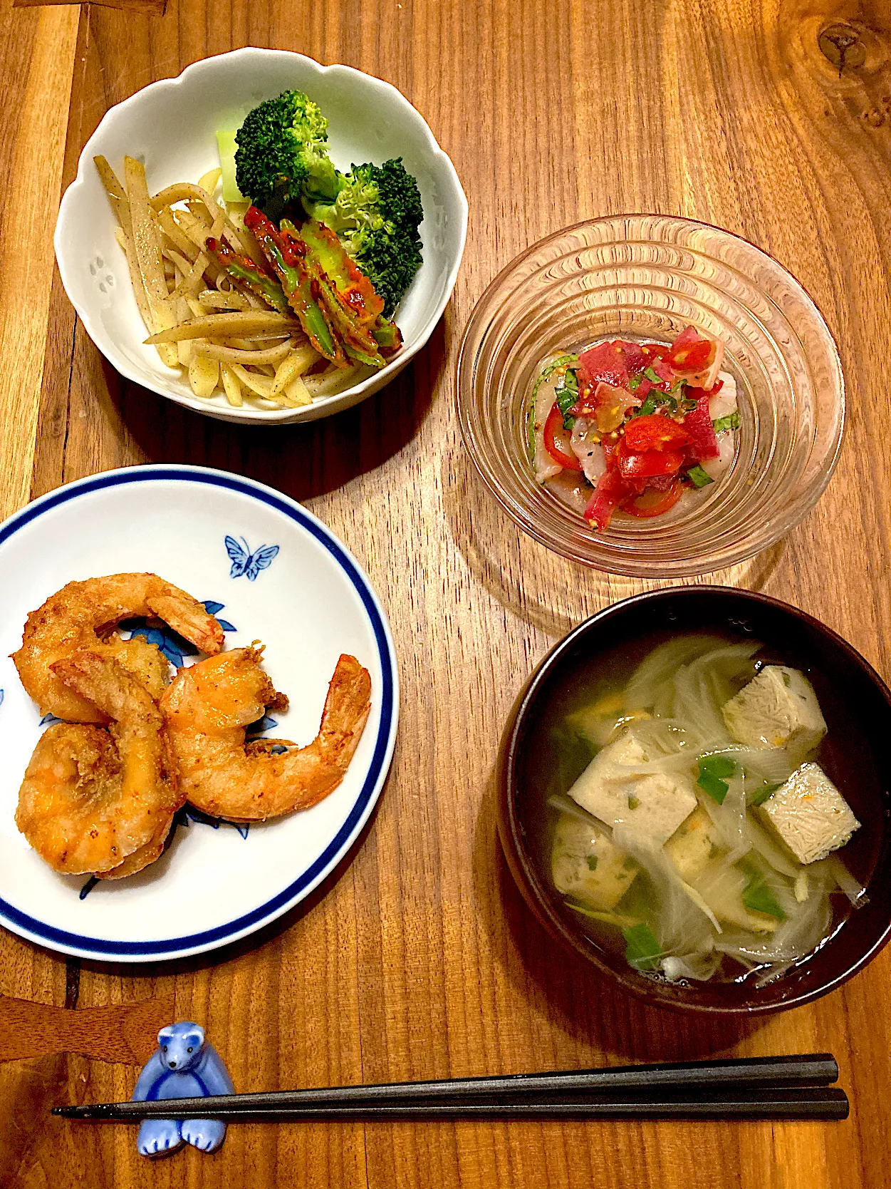 ガーリックシュリンプ、ジャガイモとブロッコリーのサラダ、ホタテのカルパッチョ、イワシつみれ汁