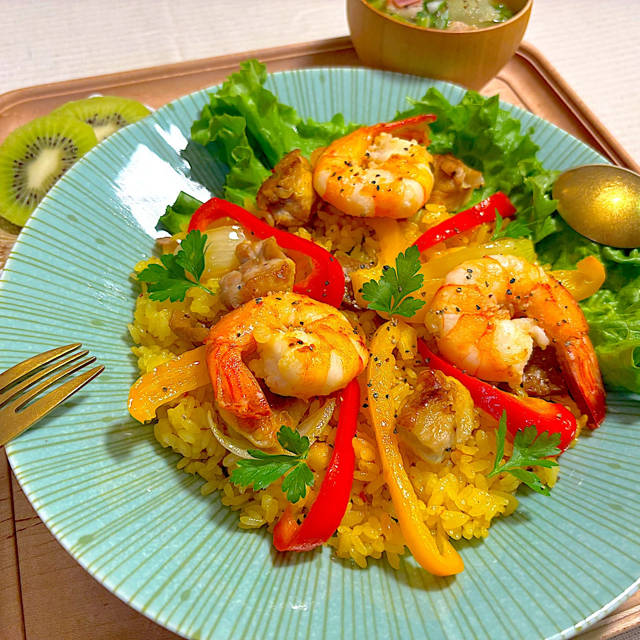・海老と鶏肉のパエリア(パプリカ、玉ねぎ、イタリアンパセリ、フリルレタス)