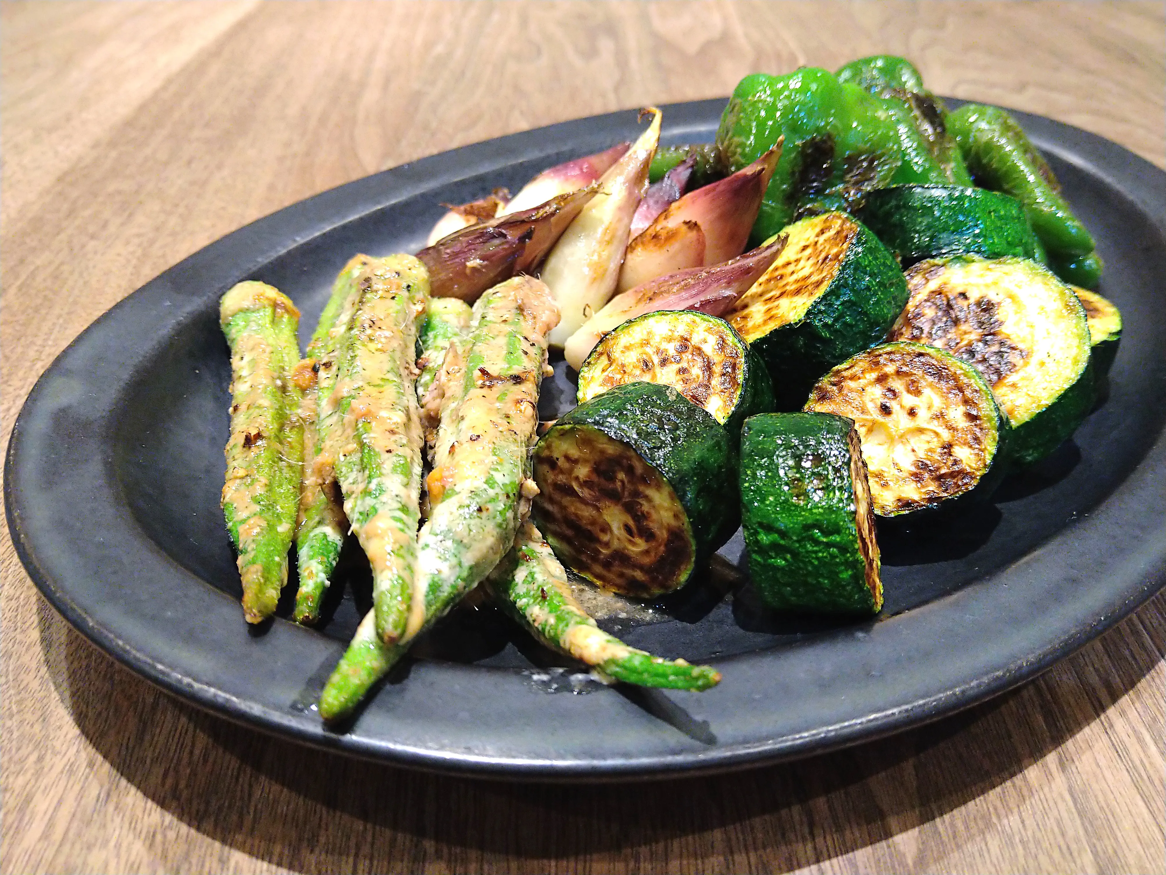 #簡単料理 #焼く/炒め物 #野菜料理 #焼き野菜#オクラ#ズッキーニ#みょうが#ピーマン#アンチョビ#マヨネーズ#ウユニの塩#南部鉄器#鉄フライパンレシピ