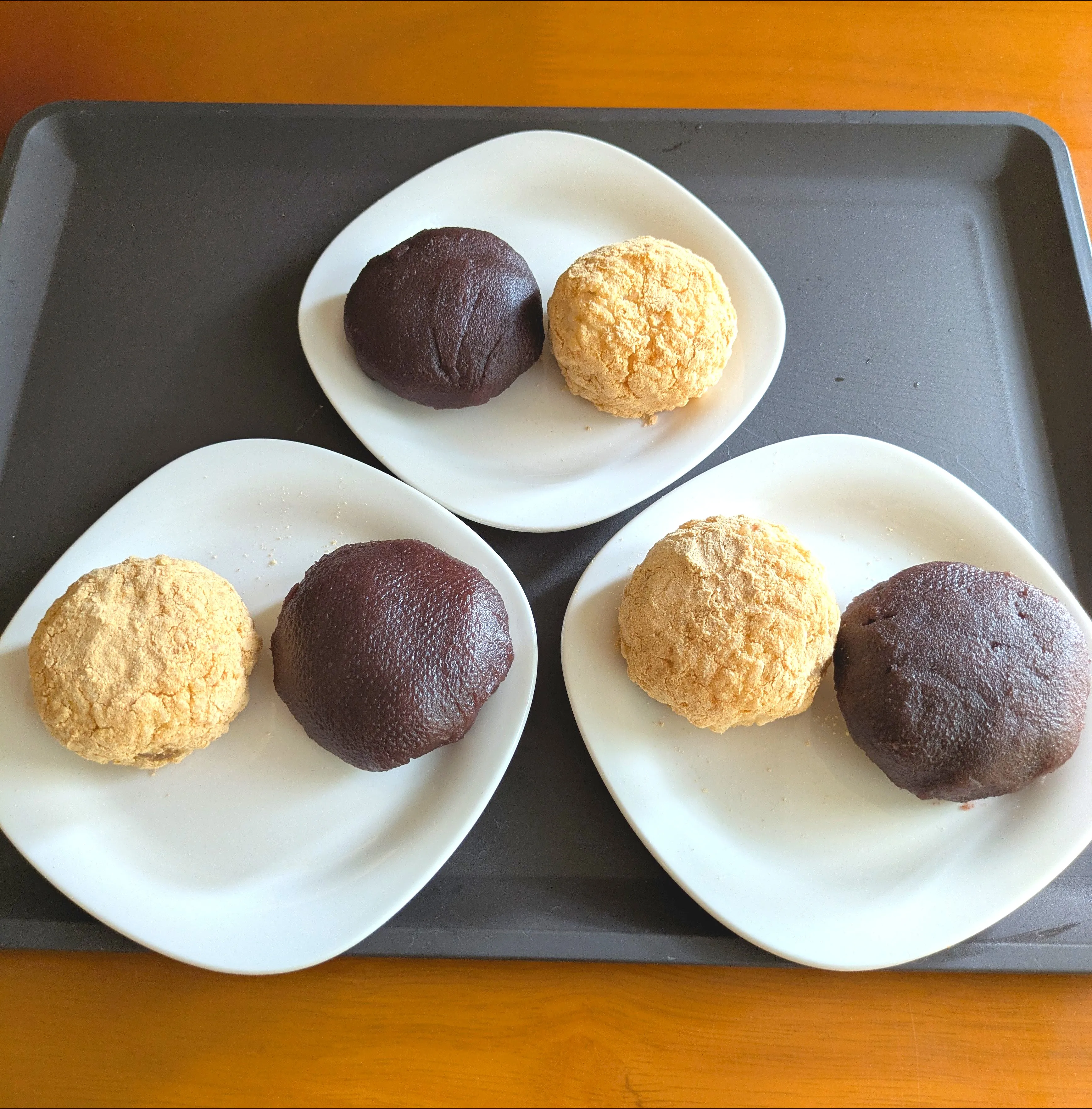 こしあんの外包みと中に入れたきな粉まぶしの2種です🤚