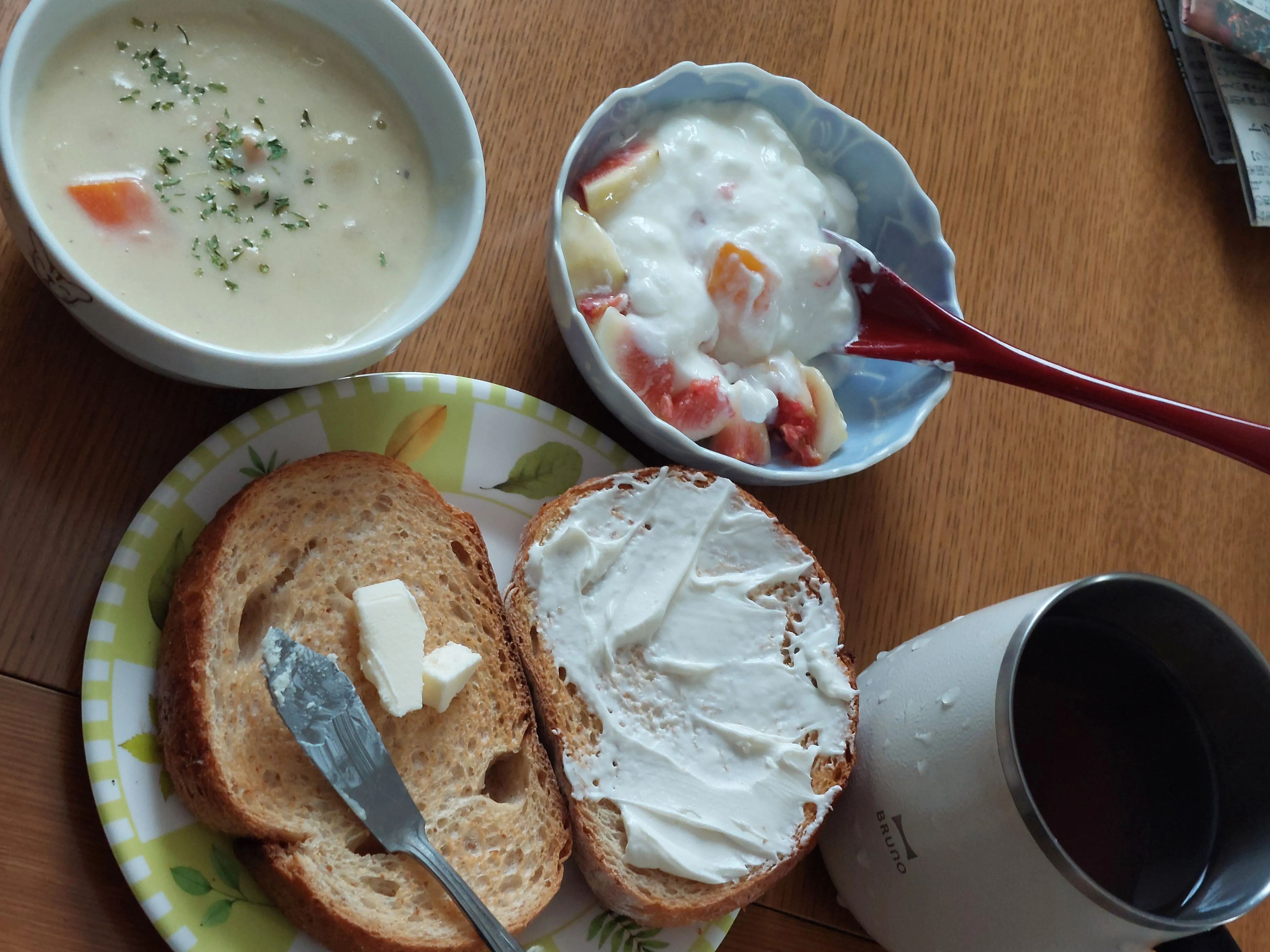 クリームシチューはみんな好きなのでたくさん作っておきます。全粒粉のパンにイチヂクと冷凍黄桃のヨーグルトあえ、紅茶は秦野産和紅茶を葉っぱから入れました。
