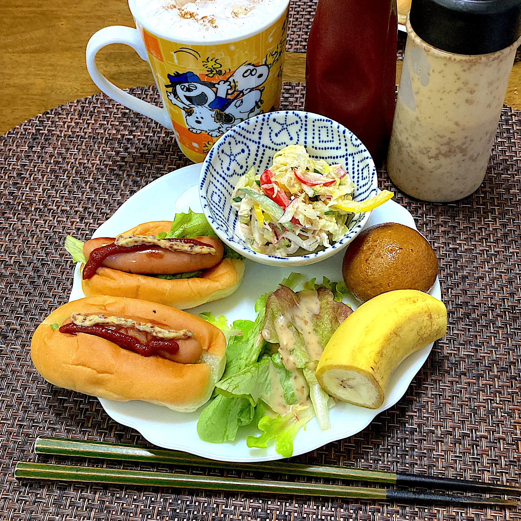 #朝食 #コールスローサラダ #まんじゅう #バナナ