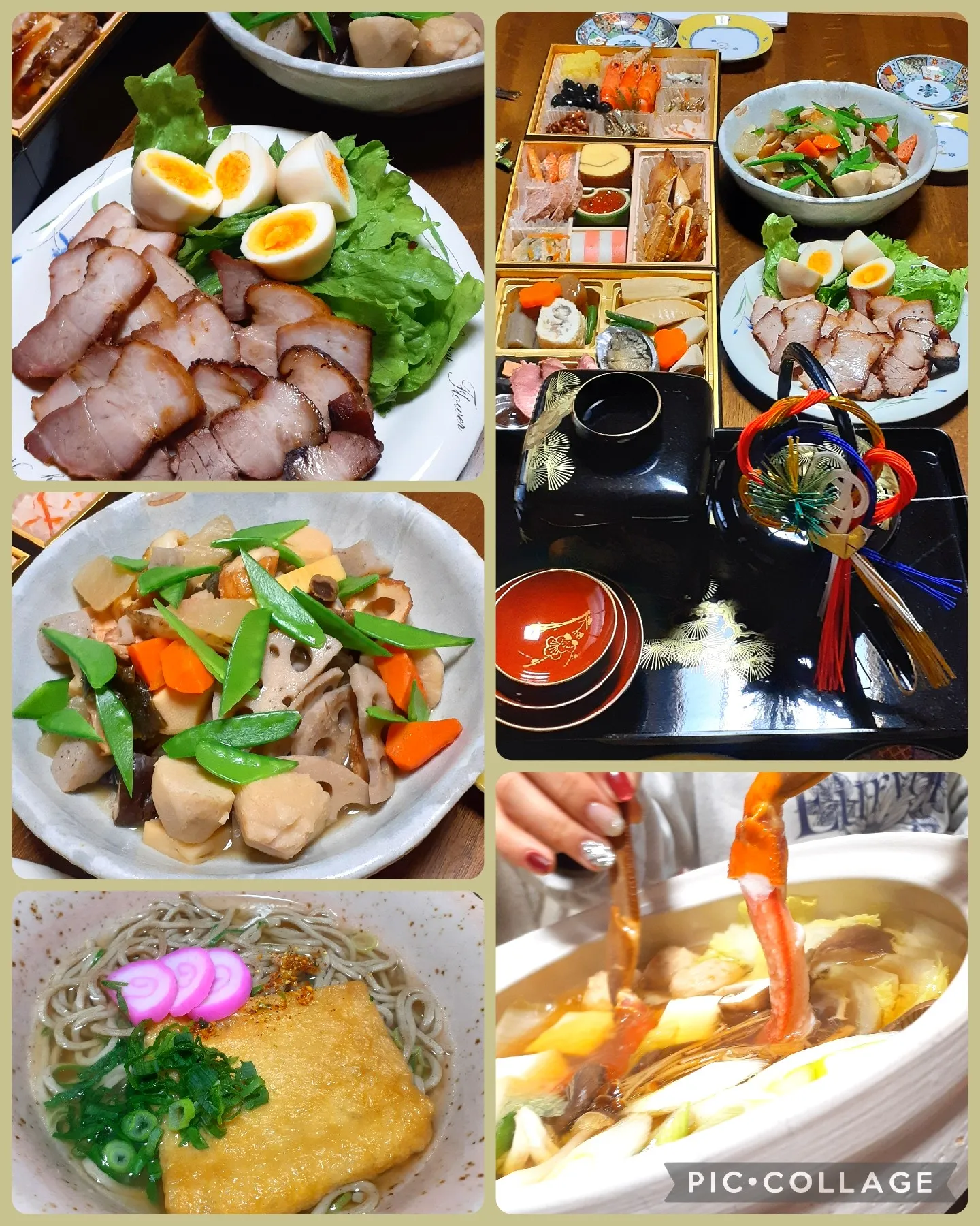 チャーシューと筑前煮、蟹鍋🦀や年越しそばとっても豪華で美味しそうです😋😋😋