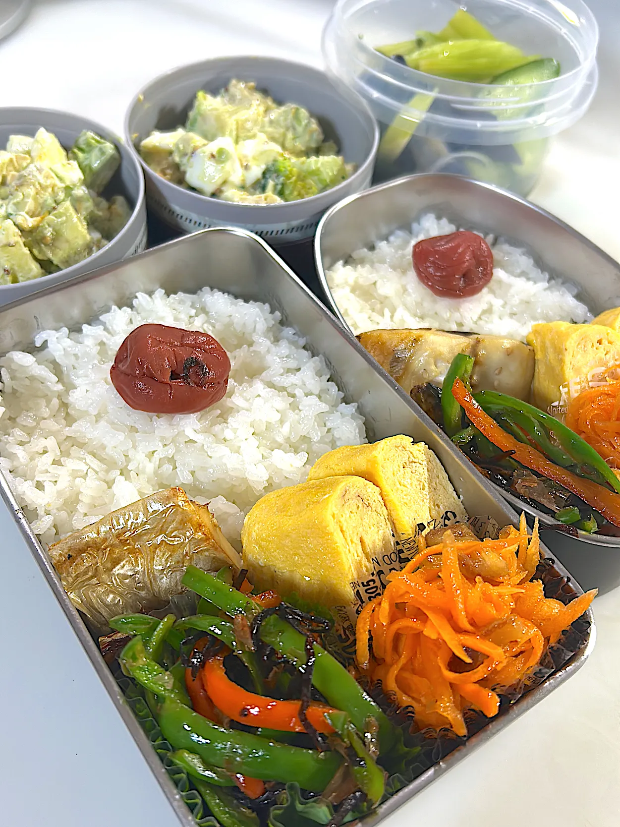 鯖の塩焼き だし巻き玉子 カラフルピーマン塩昆布炒め🫑デーツ人参ラペ🥕アボカド玉子ブロッコリーマスタードサラダ 自家製糠漬け