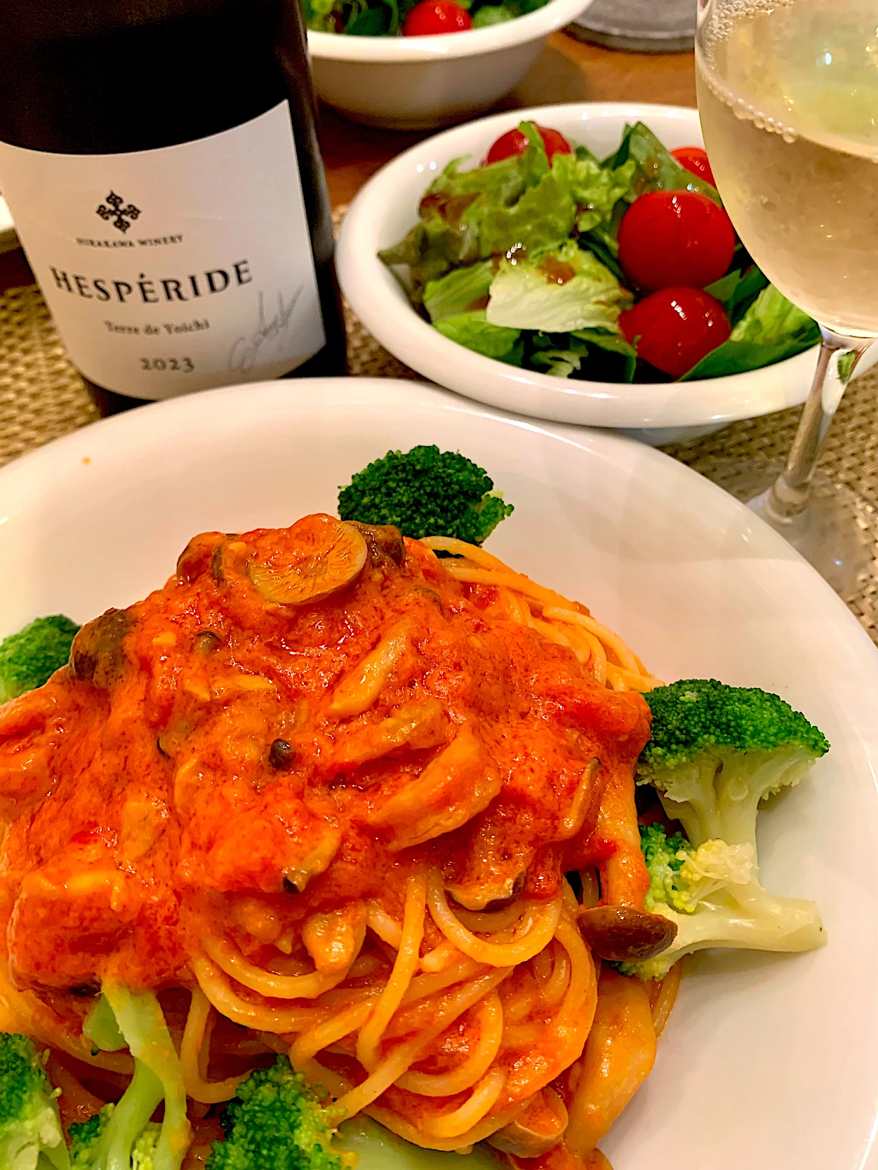 #パスタ #トマト #生クリーム #海老 #しめじ #ブロッコリー #サラダ #白ワイン #平川ワイナリー #記録用 #トマトソース