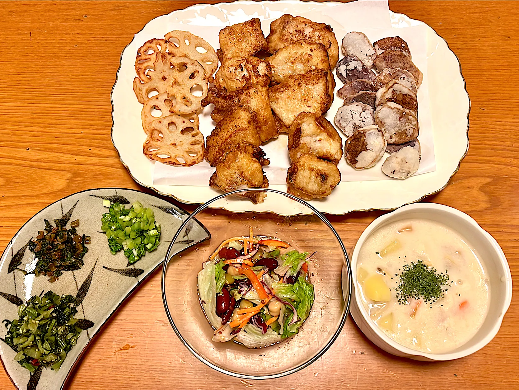 今夜は #白米 #フィッシュ&チップス #クラムチャウダー #ビーンズサラダ #お漬物