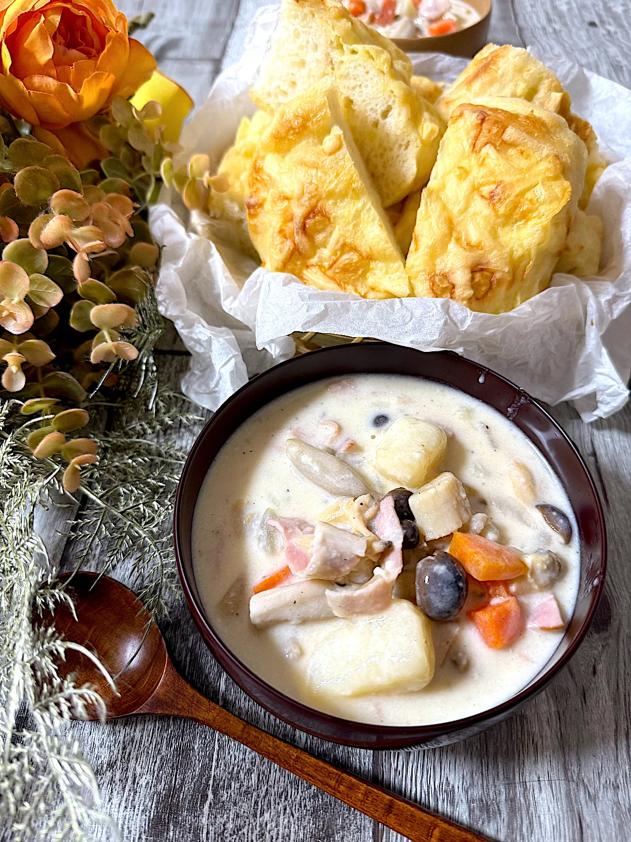 #牛乳料理部 #メグミルク #牛乳 #クラムチャウダー #チーズフォカッチャ #ブランチ