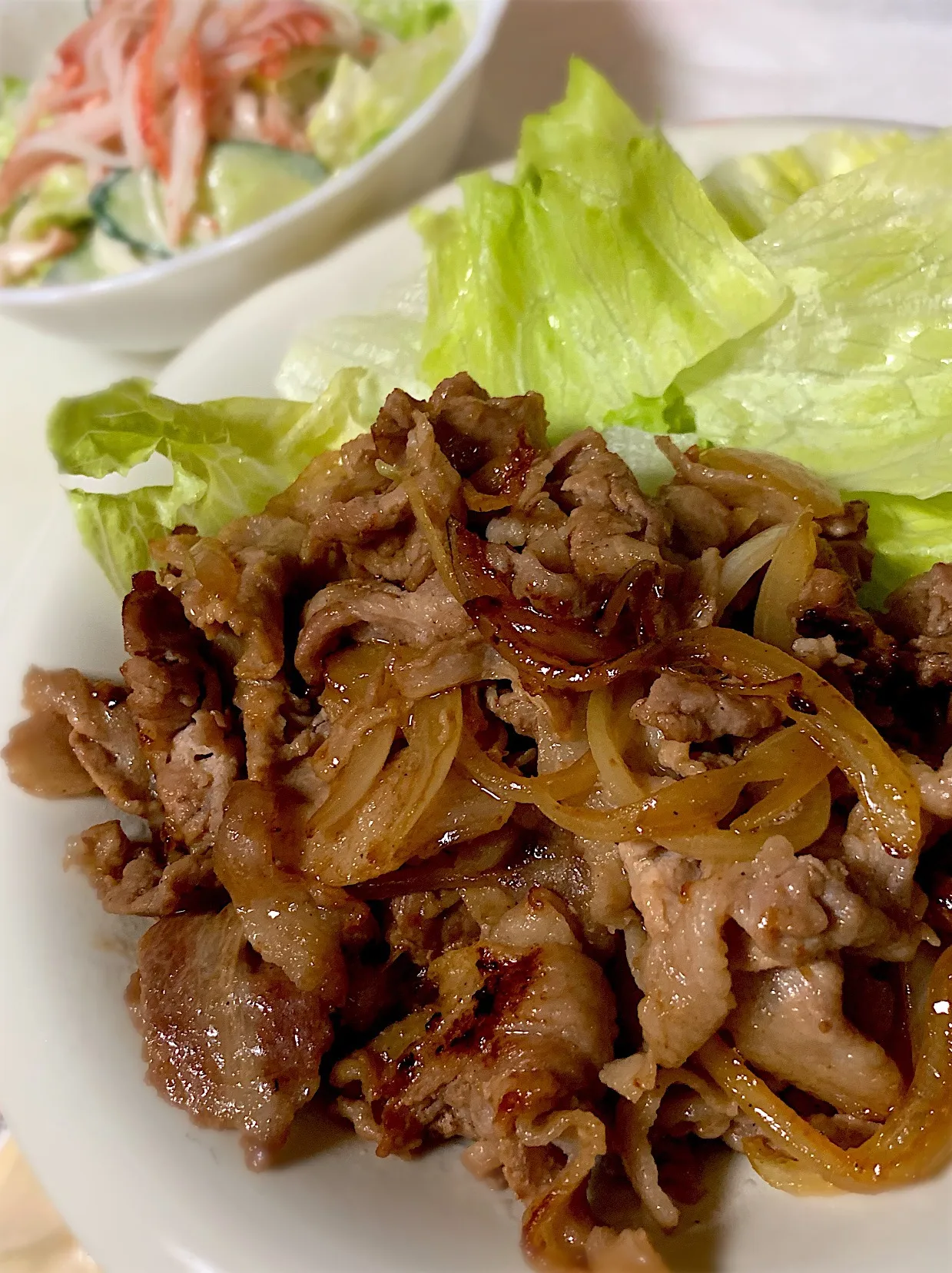 家で晩ごはん😋野菜炒めのしょうが焼き👍
