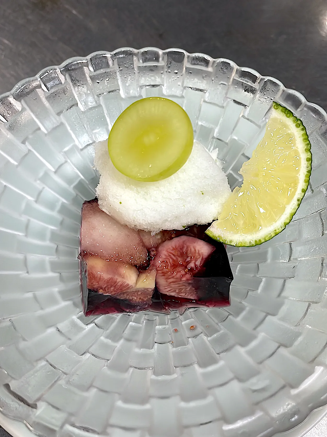 いちぢく、梨、巨峰を使った赤ワインのゼリー寄せと、宮崎の平兵衛酢(日向市)を使ったシャーベットと一緒に。お好みで果汁を絞って。