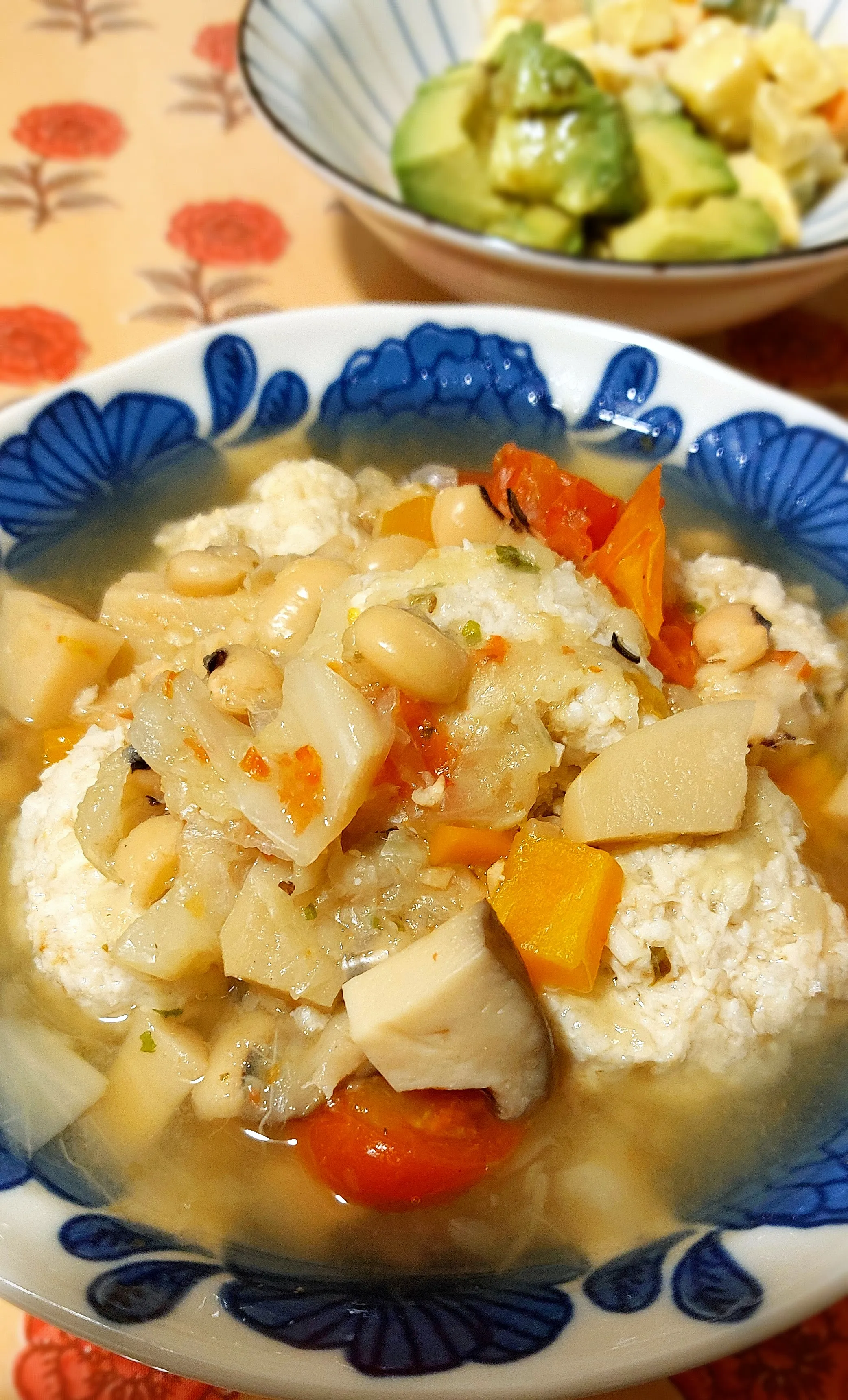 そんな時はあったかスープだよね!と鶏むね肉にはんぺんとエノキを加えた鶏団子と、ブラックアイドピー、冷蔵庫の野菜たちをたくさん入れてスープにしました!