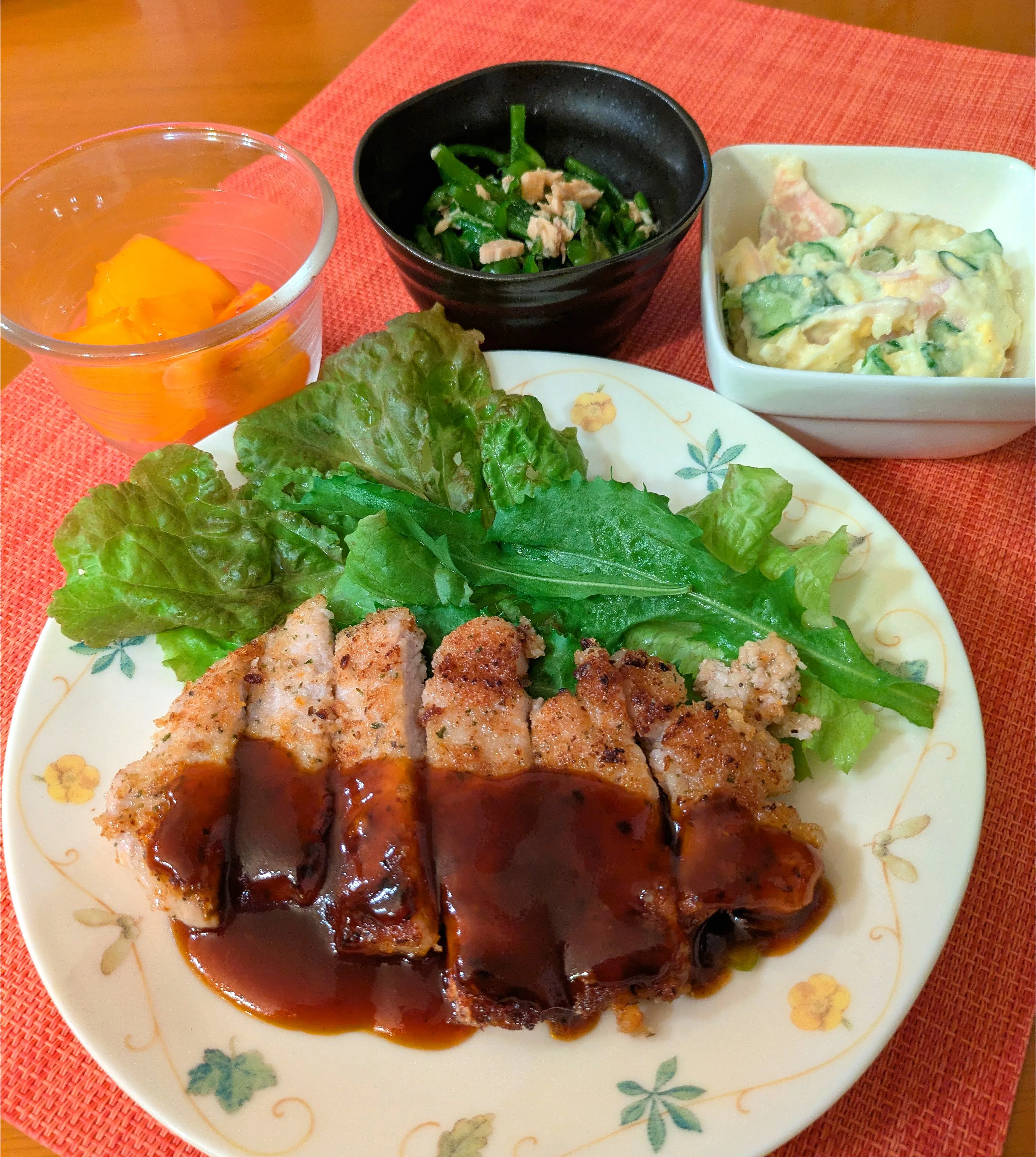 #夕食#豚ロースチーズカツレツ#ポテトサラダ#無限ピーマン#柿