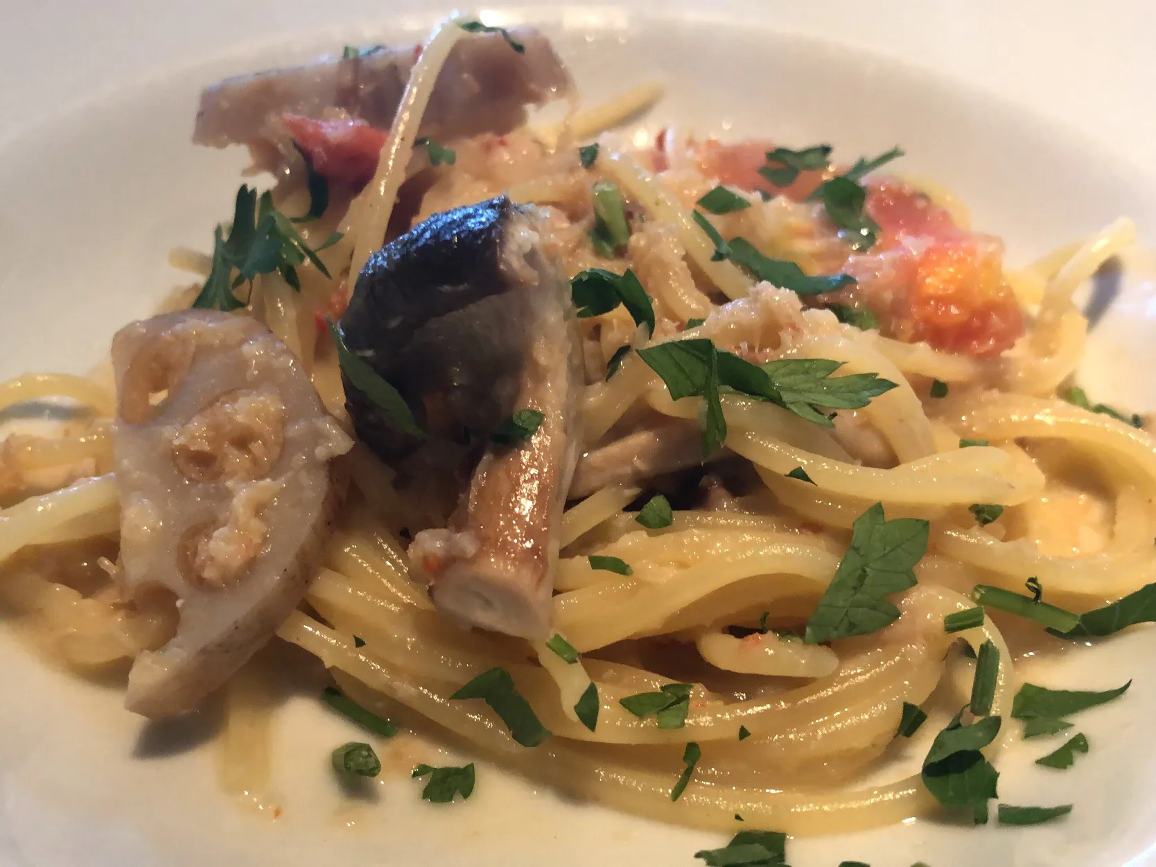 新潟産紅ズワイガニと蓮根、椎茸のペペロンチーノ