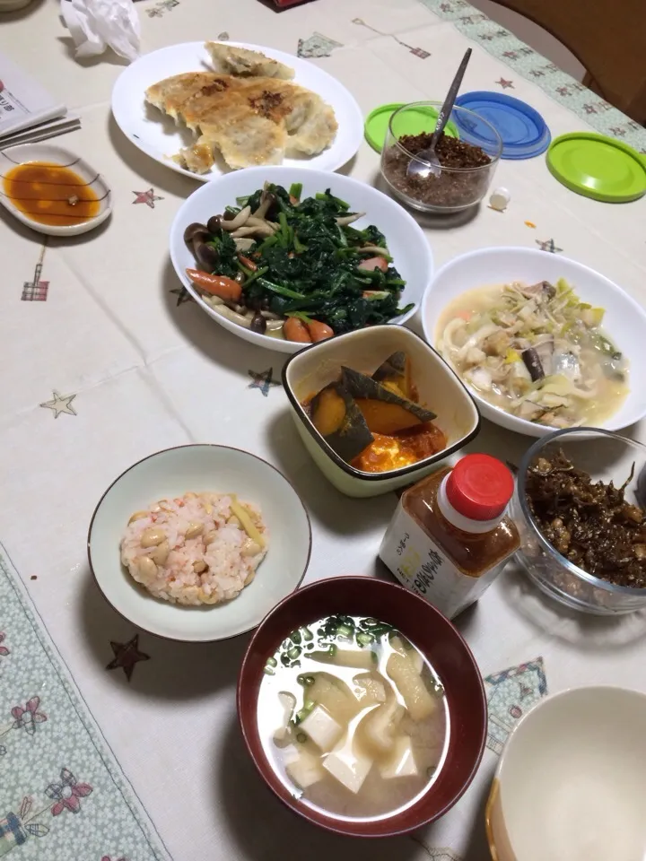 #うちのごはん 手抜きの冷凍餃子と昨日の鍋の残り。