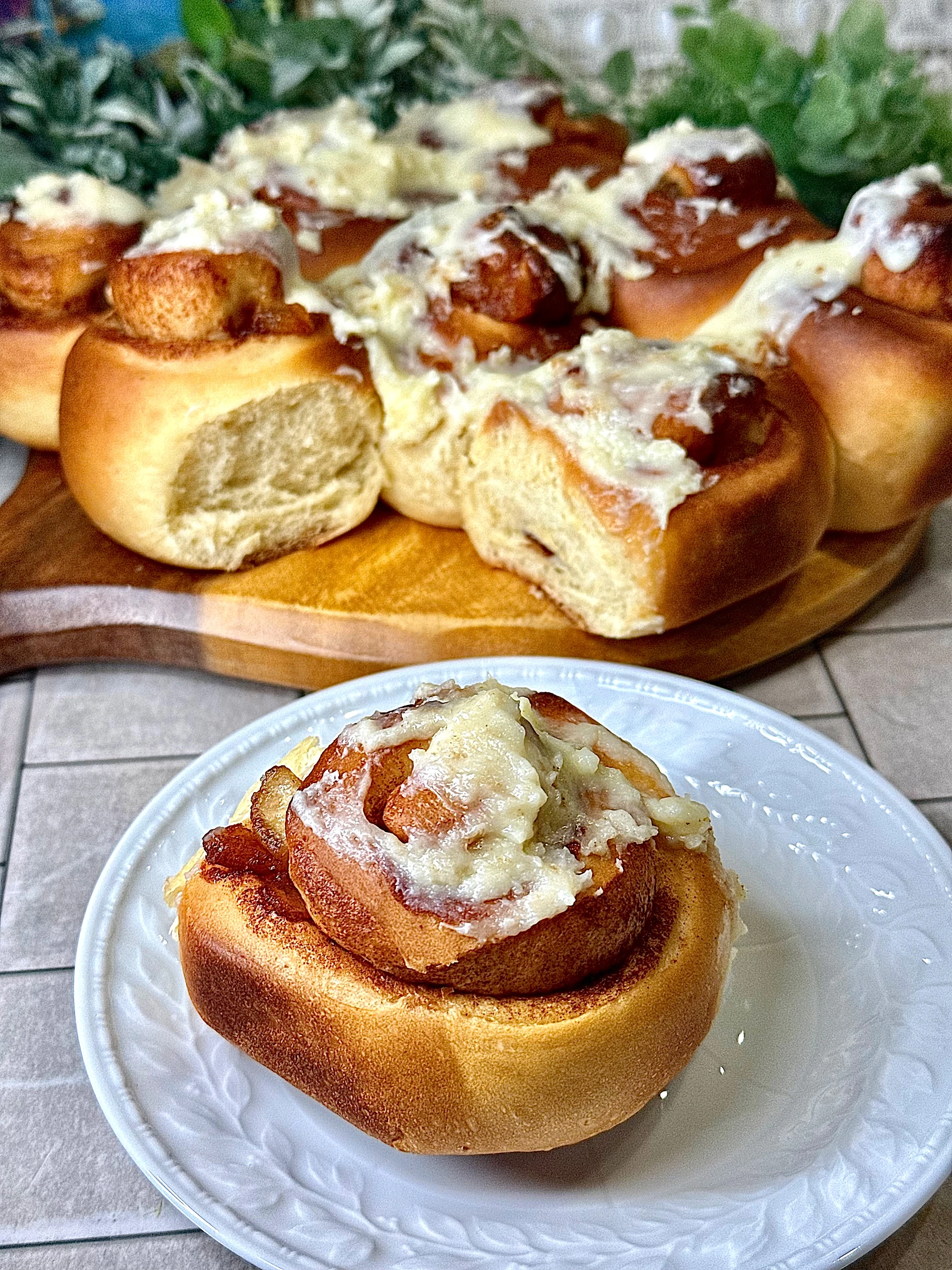 シナモンロールの上はアイシングがかかってますよね!パン教室はチーズフロスティングなんです🫢