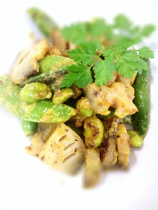 #蓮根#アンチョビ#カレー風味#スナップエンドウ