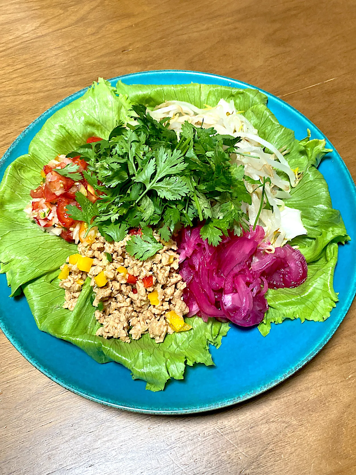 大豆のお肉ミンチと2を混ぜ、ほかの材料とともに器に盛る。