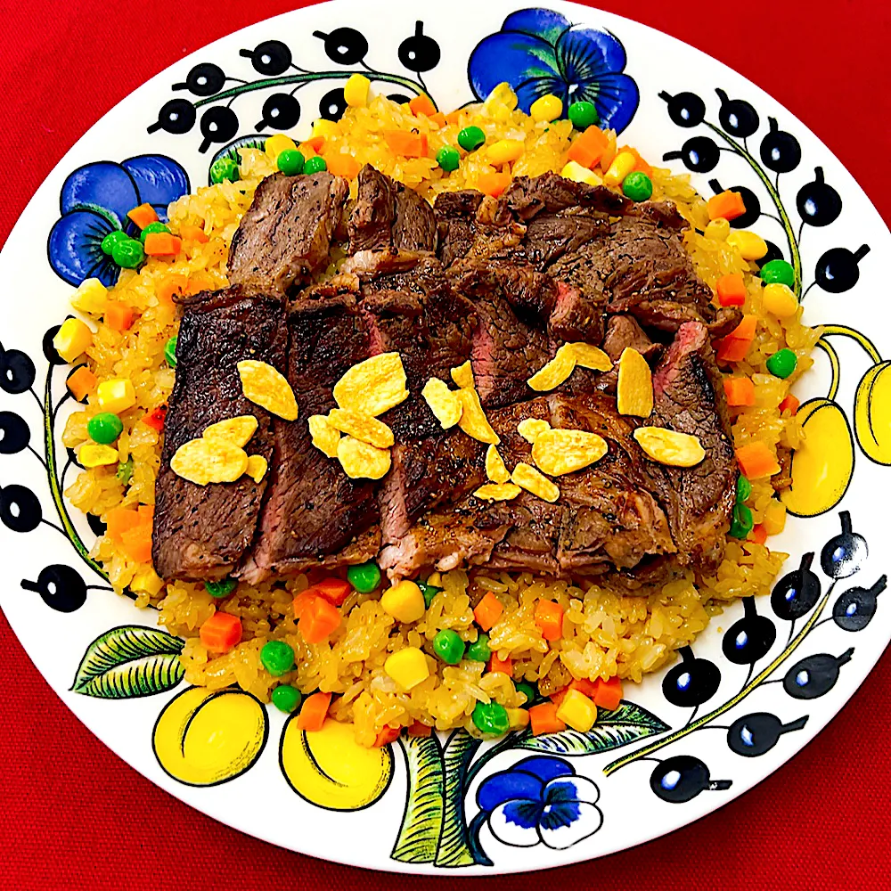 ガーリック炒飯に、ステーキ乗せたよ😊