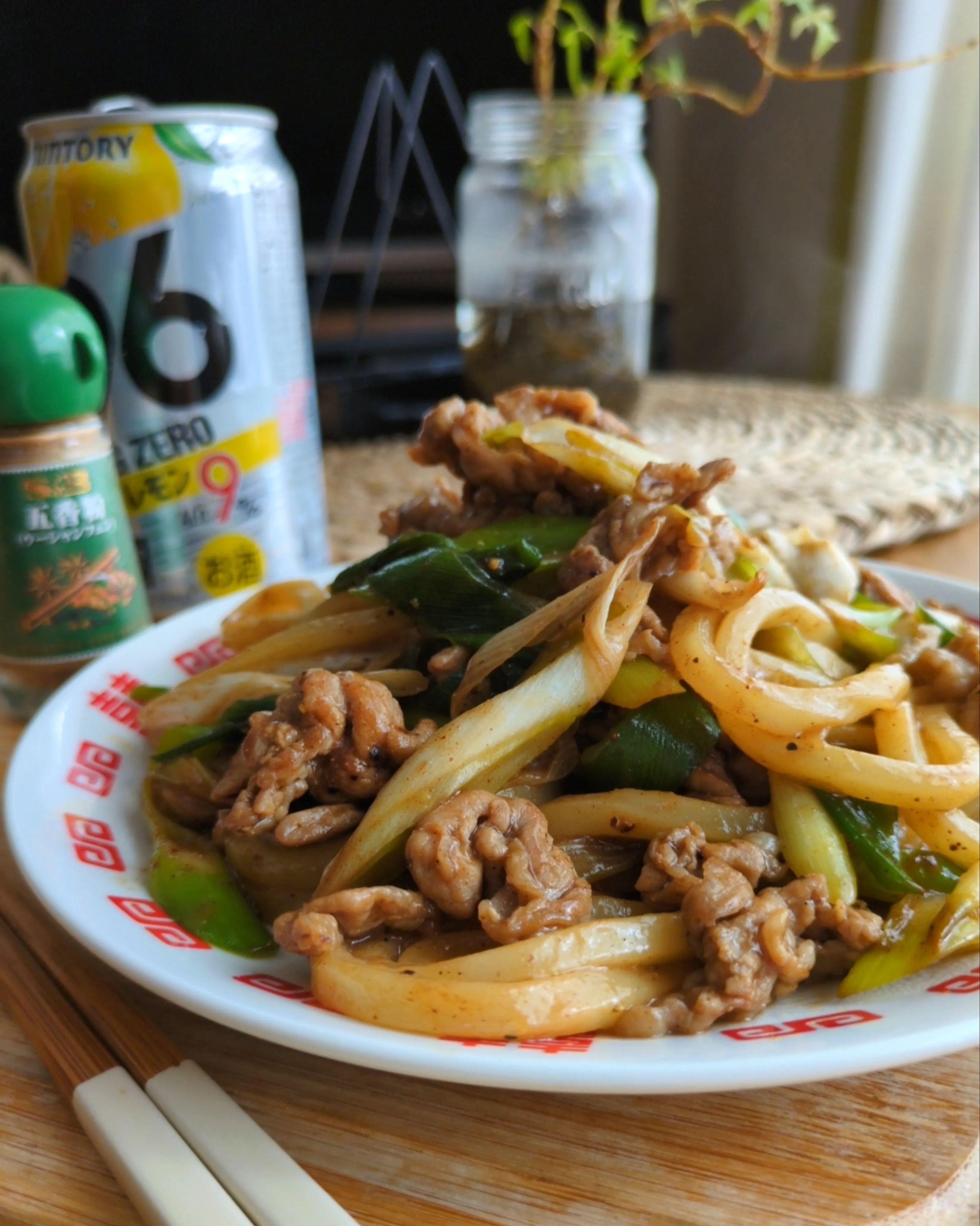 ねぎたっぷりの焼きうどんに五香粉の香り✨️