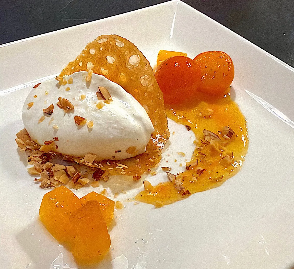 ナッツと八角のクリームをクネルにし、金柑と柿のコンポートで秋らしく飾りました
