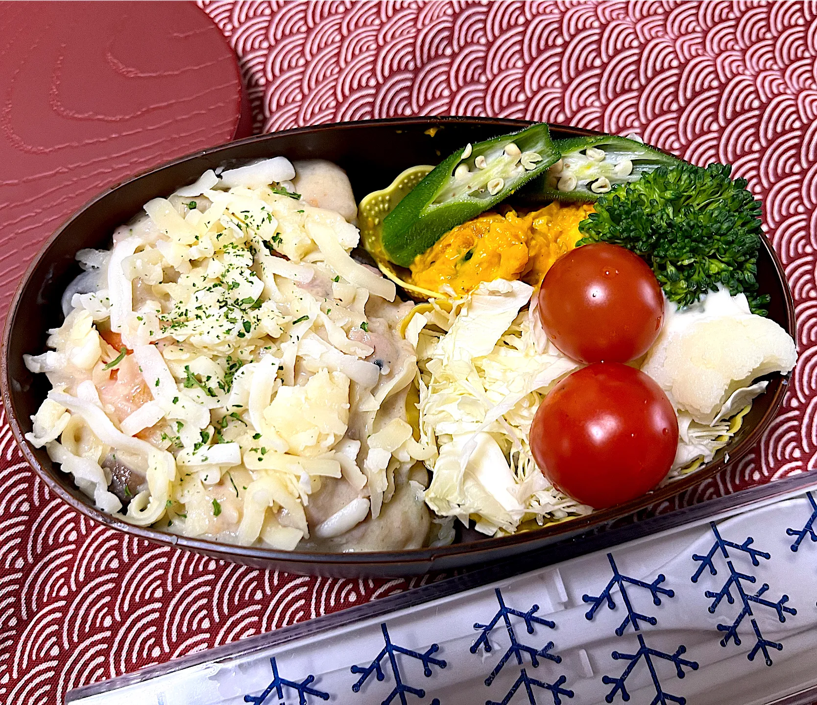 前に作って冷凍しておいたホワイトソースとガパオライスの具を使って、ドリアのお弁当〜🎶