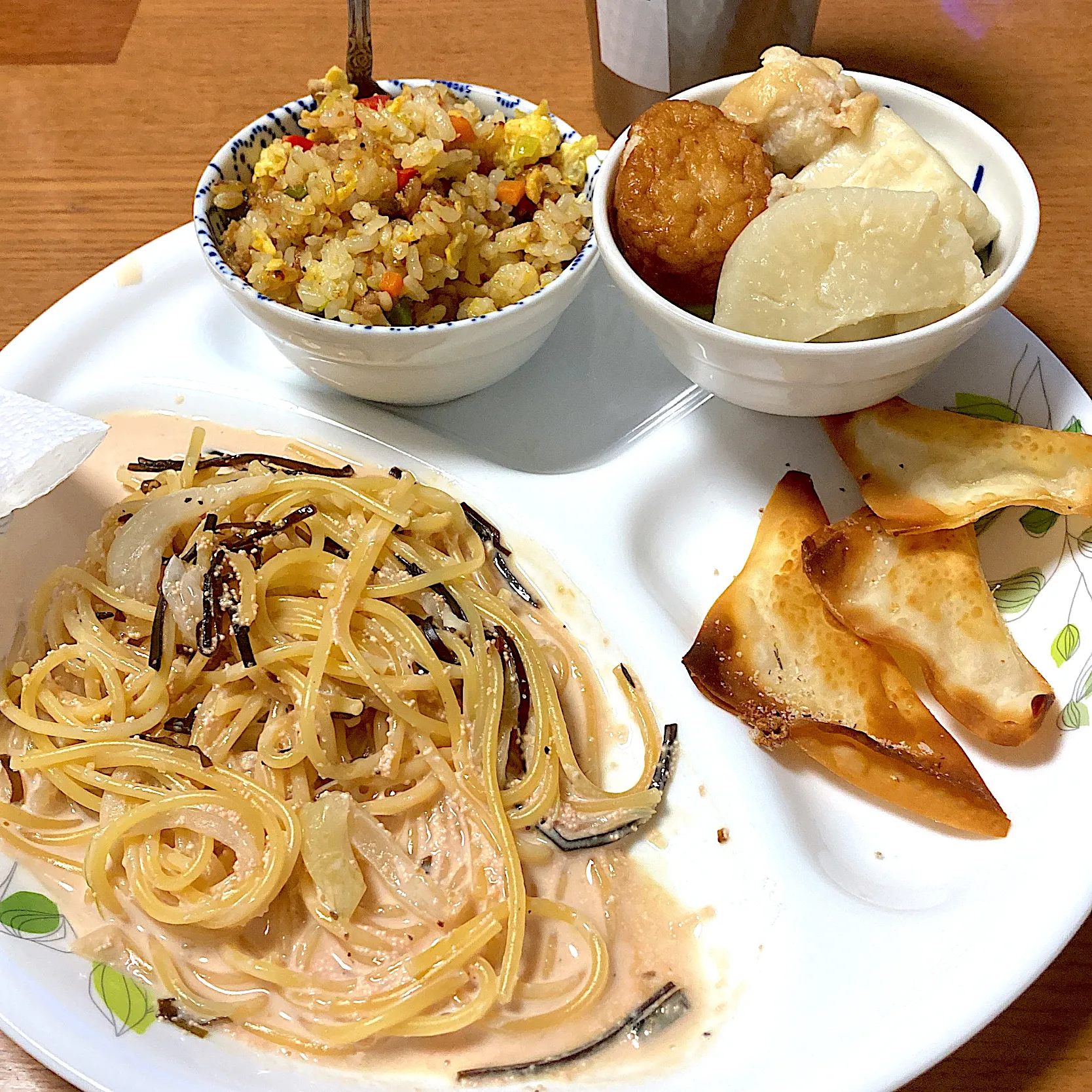#晩ごはん #ワンタンの皮チーズ揚げ #炒飯 #おでん