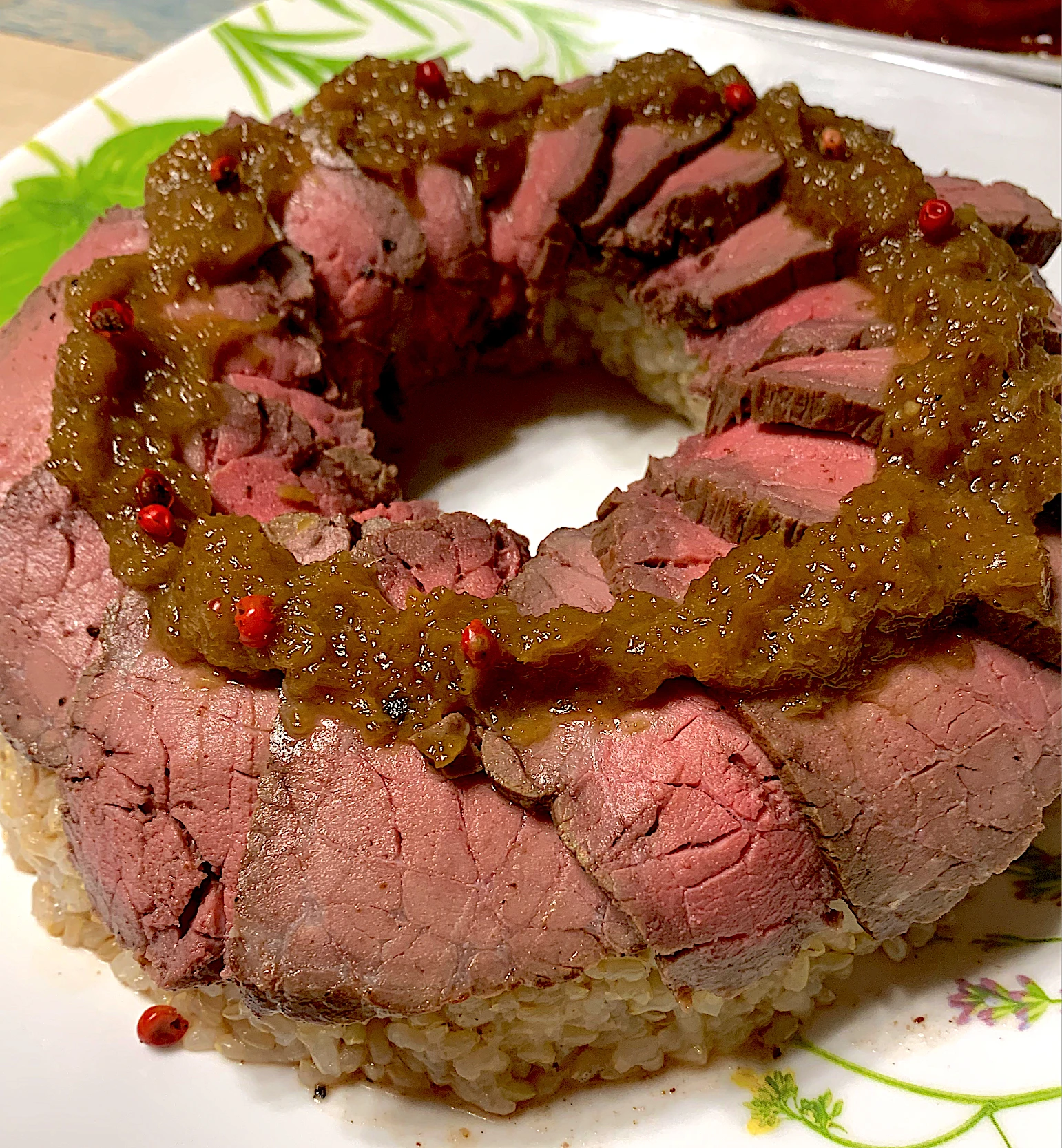 リースの形に酢飯を作って、ローストビーフを上にのせて飾りました。タマネギソースをかけてピンクこしょうを散らせて出来上がりです。ローストビーフは表面をフライパンで焼いてジプロップに入れて炊飯器に熱湯と肉を入れて保温にして仕上げました。#クリスマス #ローストビーフ #ローストビーフ寿司