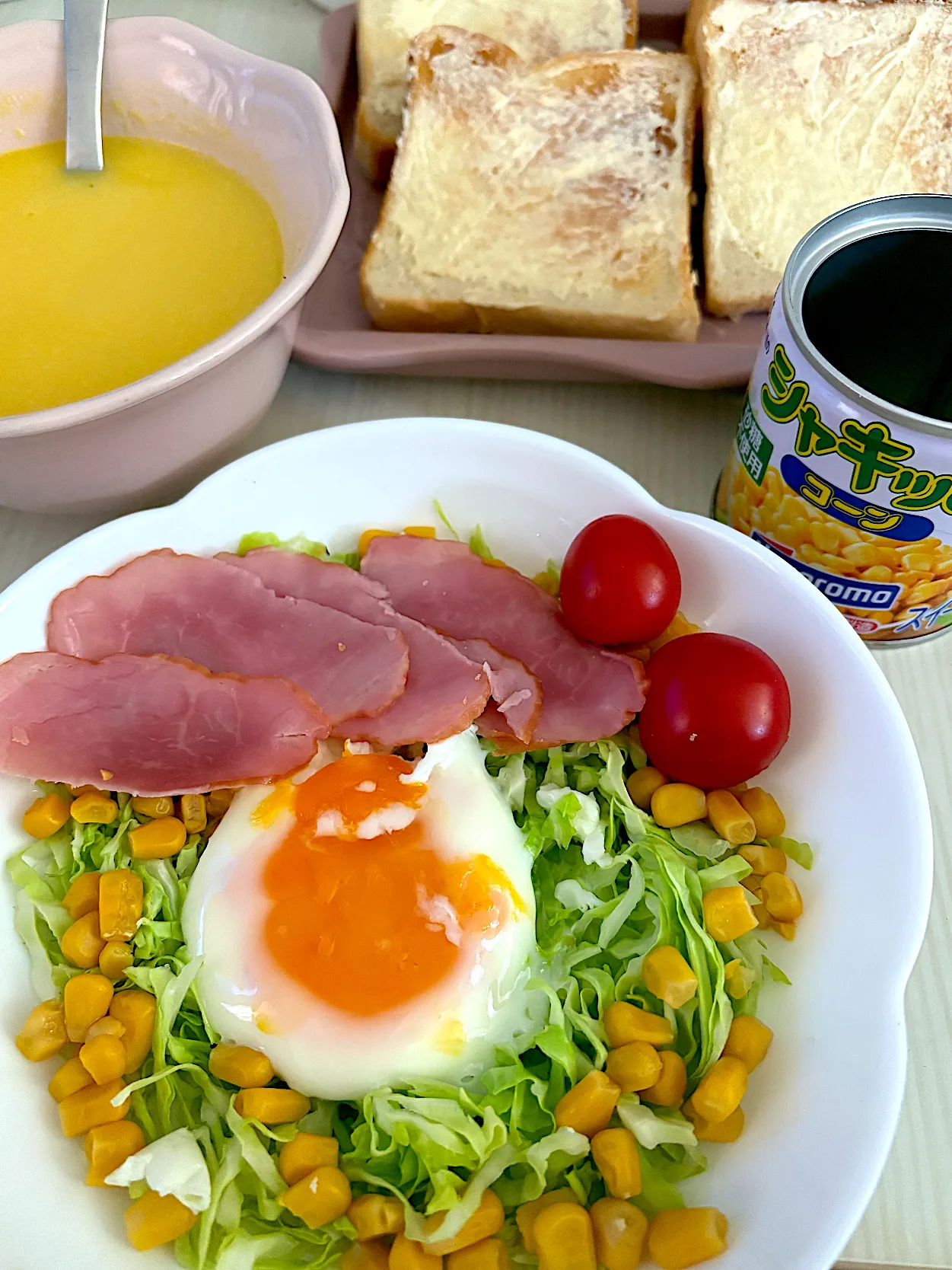 キャベツにとろっと卵にベーコン&コーンがたまらなーい😆✨