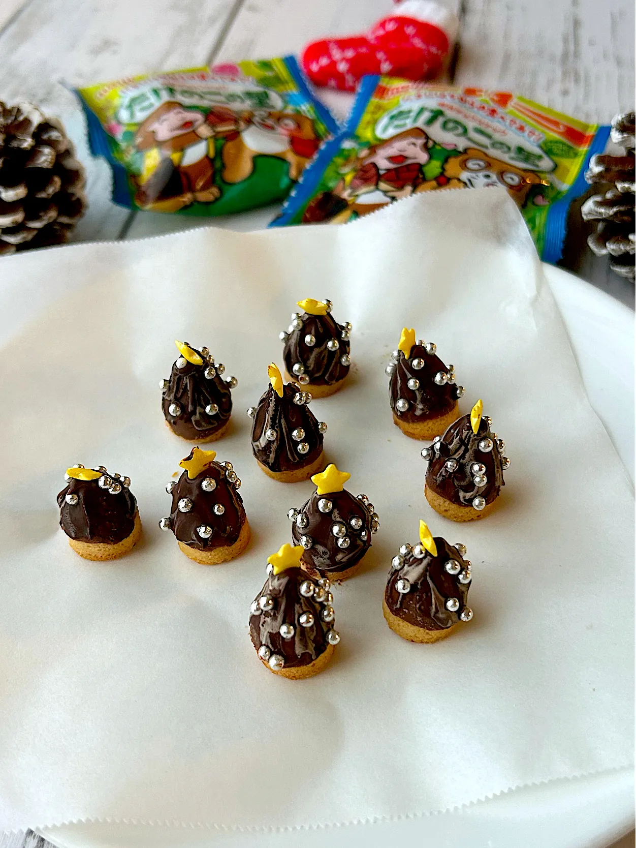慣れてくるとたけのこの里を回しながら、アラザンを満遍なく付けられるよ。