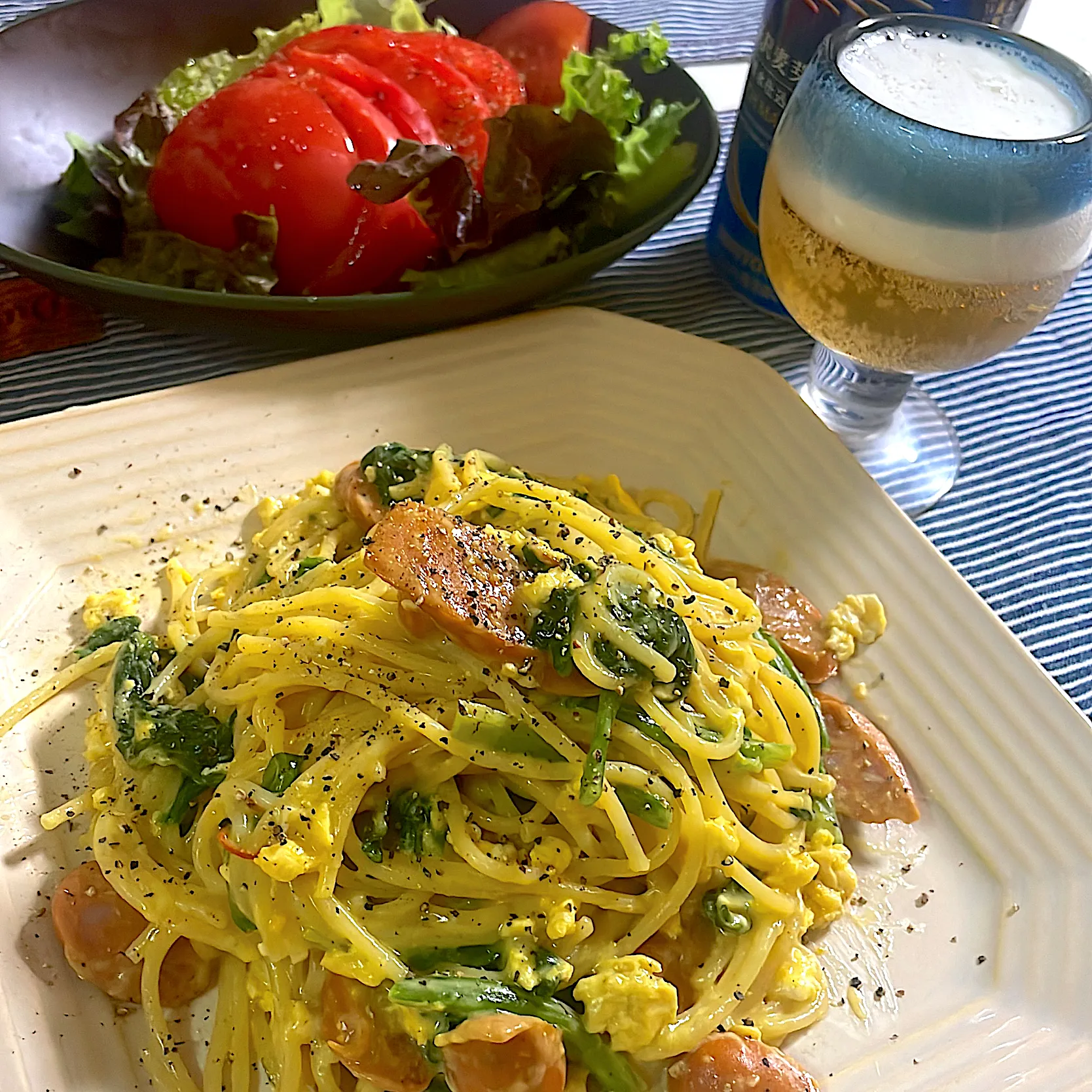 ほうれん草とチョリソーのバター炒めの残り物でカルボナーラ🍝