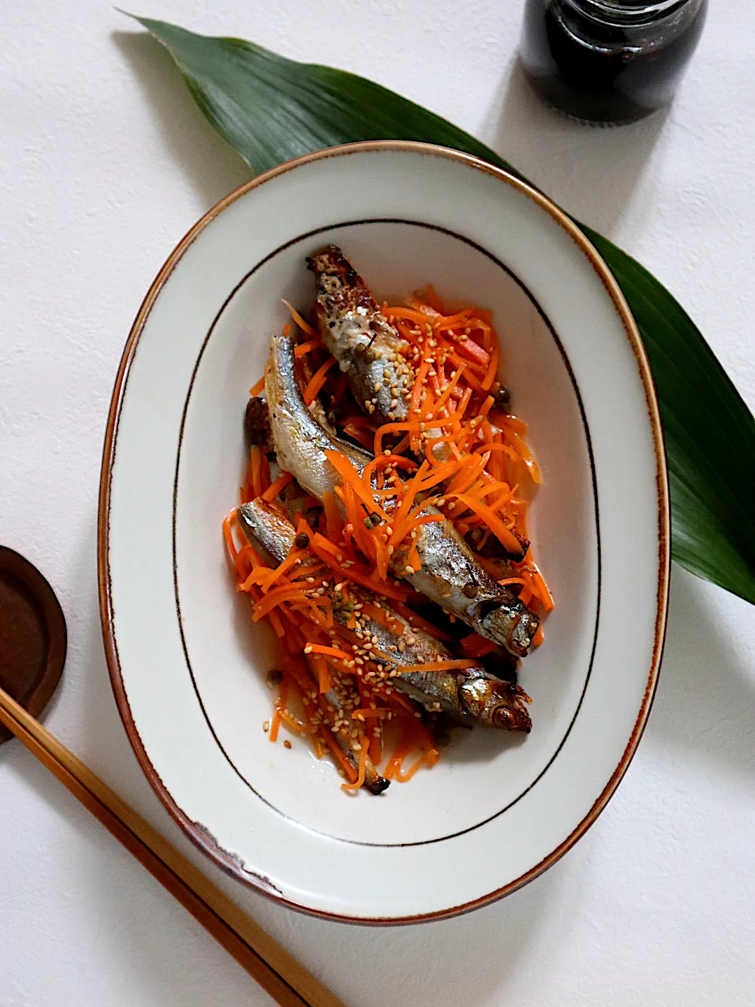 発酵人参とお酢と砂糖と実山椒と。ししゃもも焼くだけ。胡麻油で焼いても美味しいー